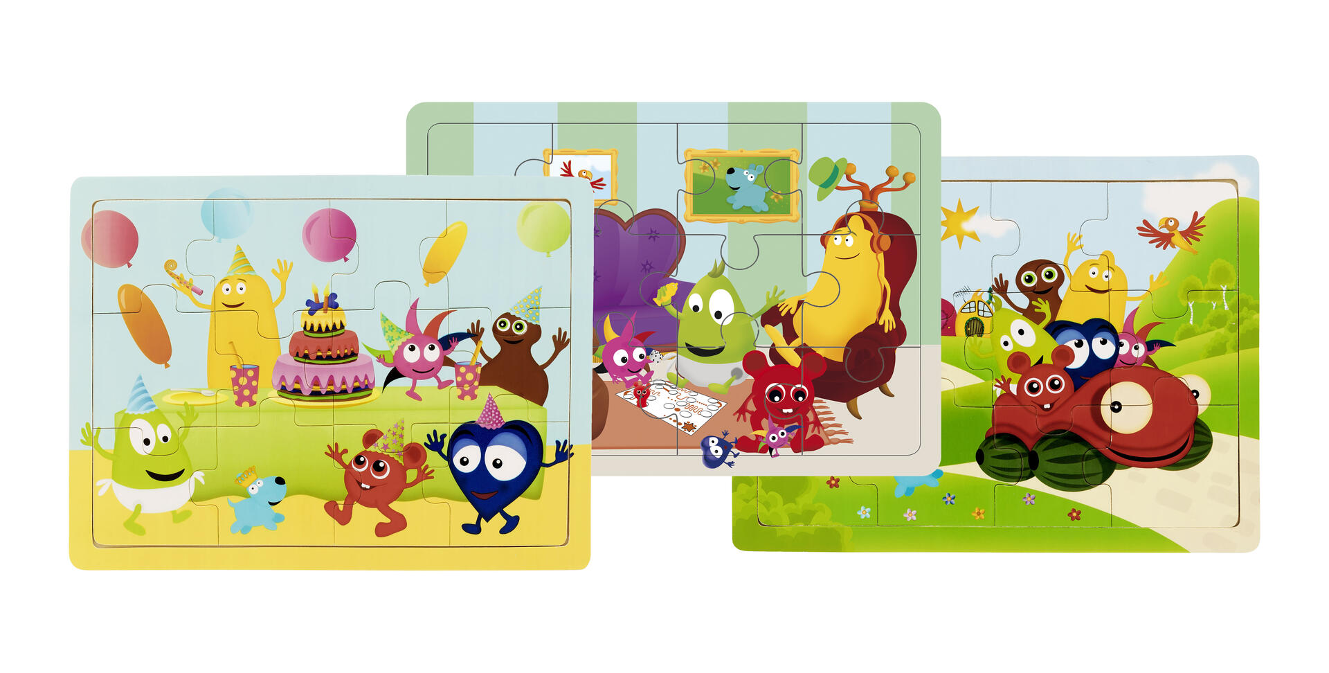 3 st/fp. Set med motiv av Babblarna när de är på olika äventyr. Gedigna träpussel med 12 bitar i ram. Här tränas färger och former tillsammans med motoriken. Mått: 30x21 cm. PVC-fri. Från 3 år.