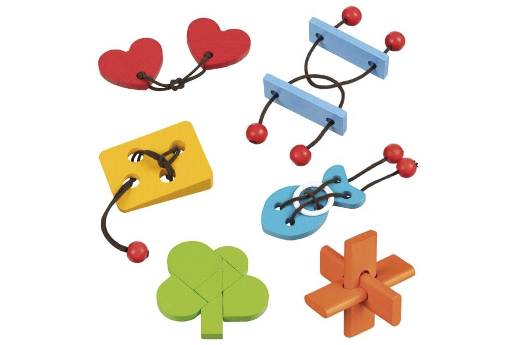 Paket med 4 olika matematiska pussel i trä. Utvecklar förmågor gällande siffror och antal, rumsuppfattning, geometriska formerm och storlekar. PVC-fri. Ålder: från 3 år.