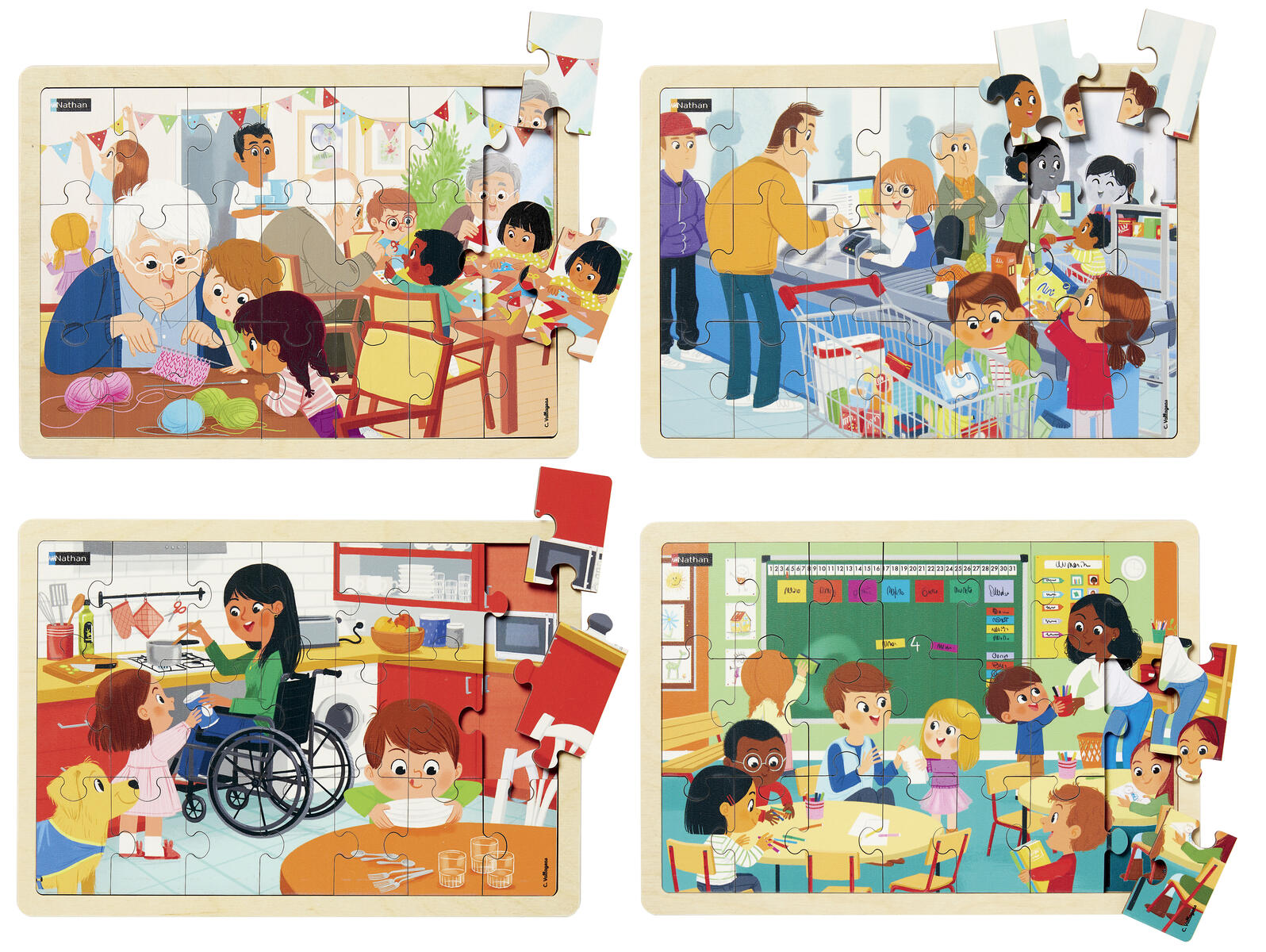 4 färgglada och detaljrika träpussel med vardagsmiljöer där barn hjälper vuxna. Varje pussel har motivet tryckt på ett plastunderlägg som man kan välja att lägga efter om det känns svårt. Varje pussel innehåller 21 bitar. PVC-fri. Från 3 år.