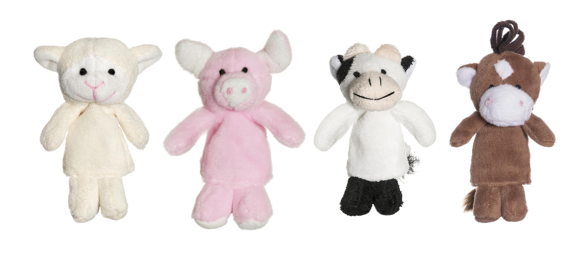 4 st/fp. Härliga fingerdockor av hög kvalitet. Fingerdockor uppmanar till lek och att prata samt inspirerar till spännande sagor. Kombinera gärna flera dockor för att skapa en mer livfull berättelse. Innehåller ett får, en gris, en ko och en häst. Mått: 9 cm. Tillverkade i mjukt fleecematerial. PVC-fri. Från 3 år.
