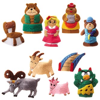 10 st/fp. Fina fingerdockor som hjälper till att få mer liv i berättandet. Innehåller fingerdockor till de klassiska sagorna Bockarna Bruse och Guldlock. Kan även sättas direkt på en flanoduk då de har kardborrefäste i ryggen. Mått: ca 10x5 cm. Material: 100 % filt i polyester. PVC-fri. Från 3 år.