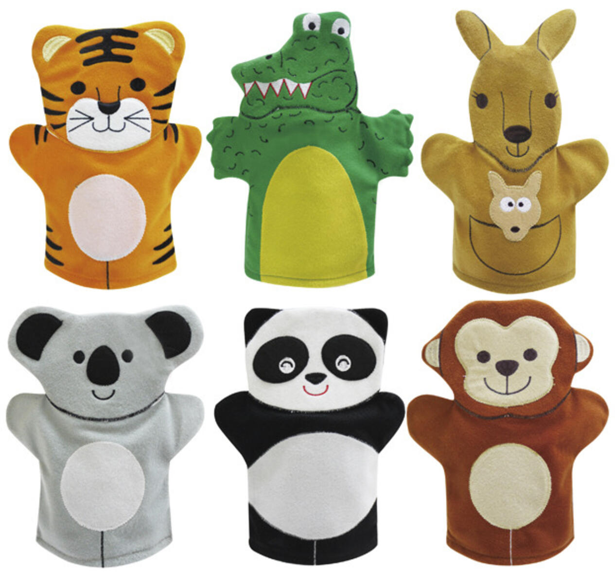 6 st/fp. Fina och välsydda handdockor med vilda djur. Innehåller tiger, krokodil, känguru, koala, panda och apa. Längd ca 28 cm. Av polyester. PVC-fri. Maskintvätt, 30 °C. Från 3 år.