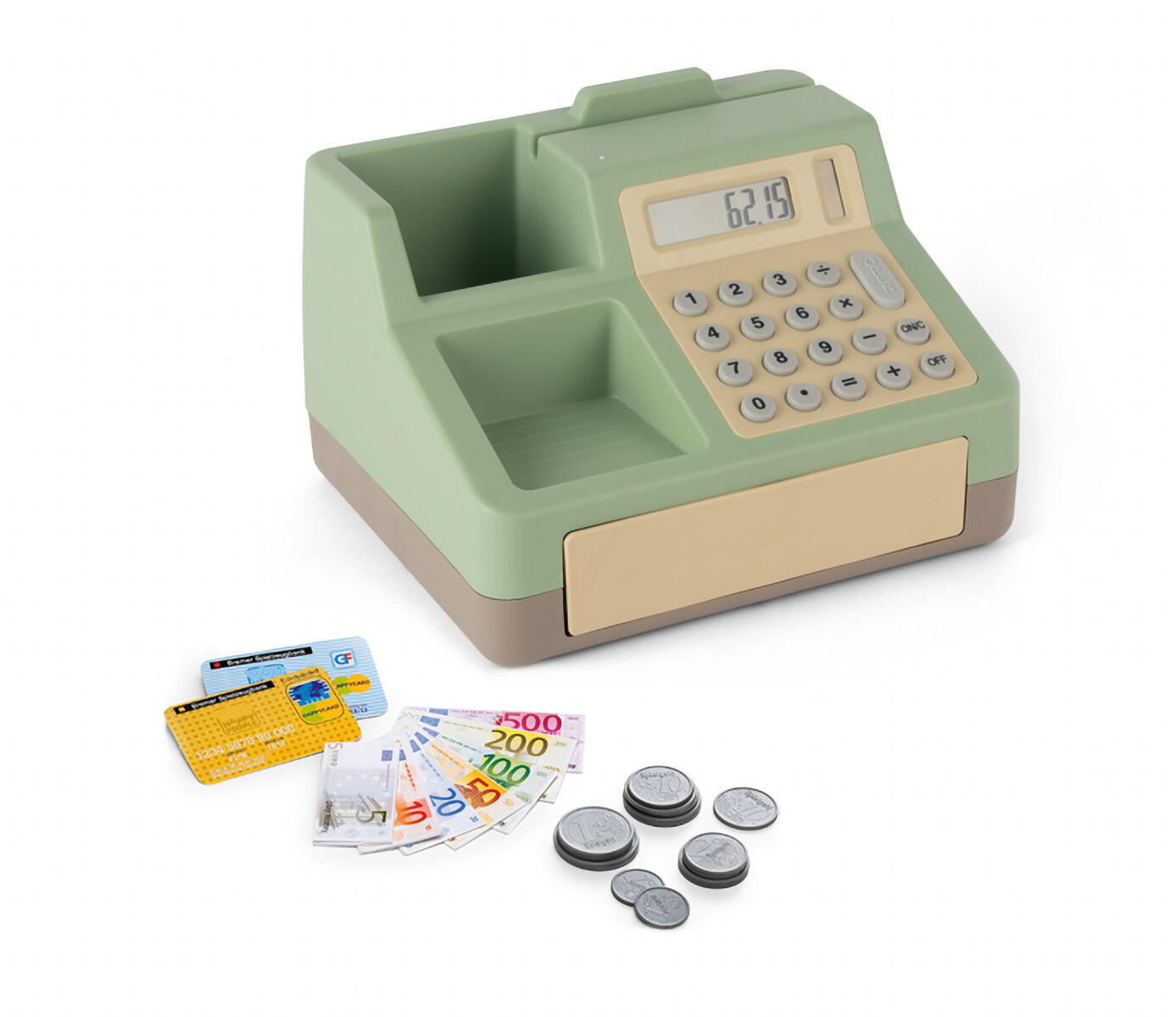 Kassaapparat som stimulerar barns rollspel och utvecklar deras förståelse för siffror, pengar och sociala interaktioner. Utrustad med en soldriven miniräknare, utan behov av batteribyte. Lekpengar ingår. Av HDPE och ABS. PVC-fri. Från 3 år.