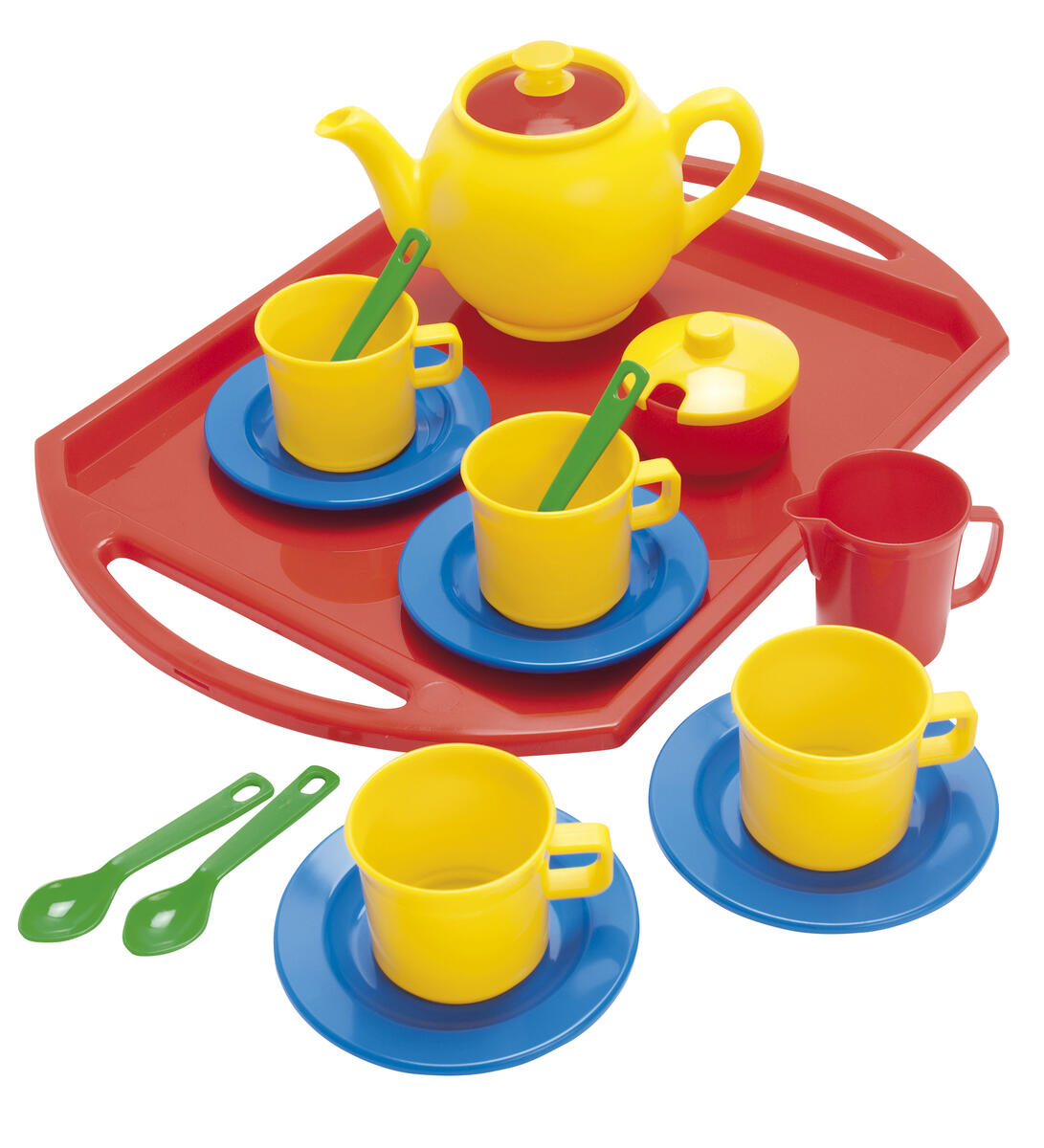 Kaffeservic där det ingår kaffekanna, bricka, sockerskål, mjölkkanna, koppar, fat och skedar. Av PE. Svanenmärkt, licensnummer 50950001.PVC-fri. Från 2 år.