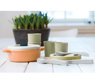 En unik servis som är helt baserad på sockerrör och är 100 % återvinningsbar. En komplett servis för 8 personer med tallrikar, bestick, muggar, kaffekoppar, 2 grytor, 2 bringare, sockerskålar, stekspade, slev m.m. Tål frost och kan diskas i diskmaskin. Livsmedelsgodkänd. Svanenmärkt, licensnummer 50950001. PVC-fri. Från 2 år.