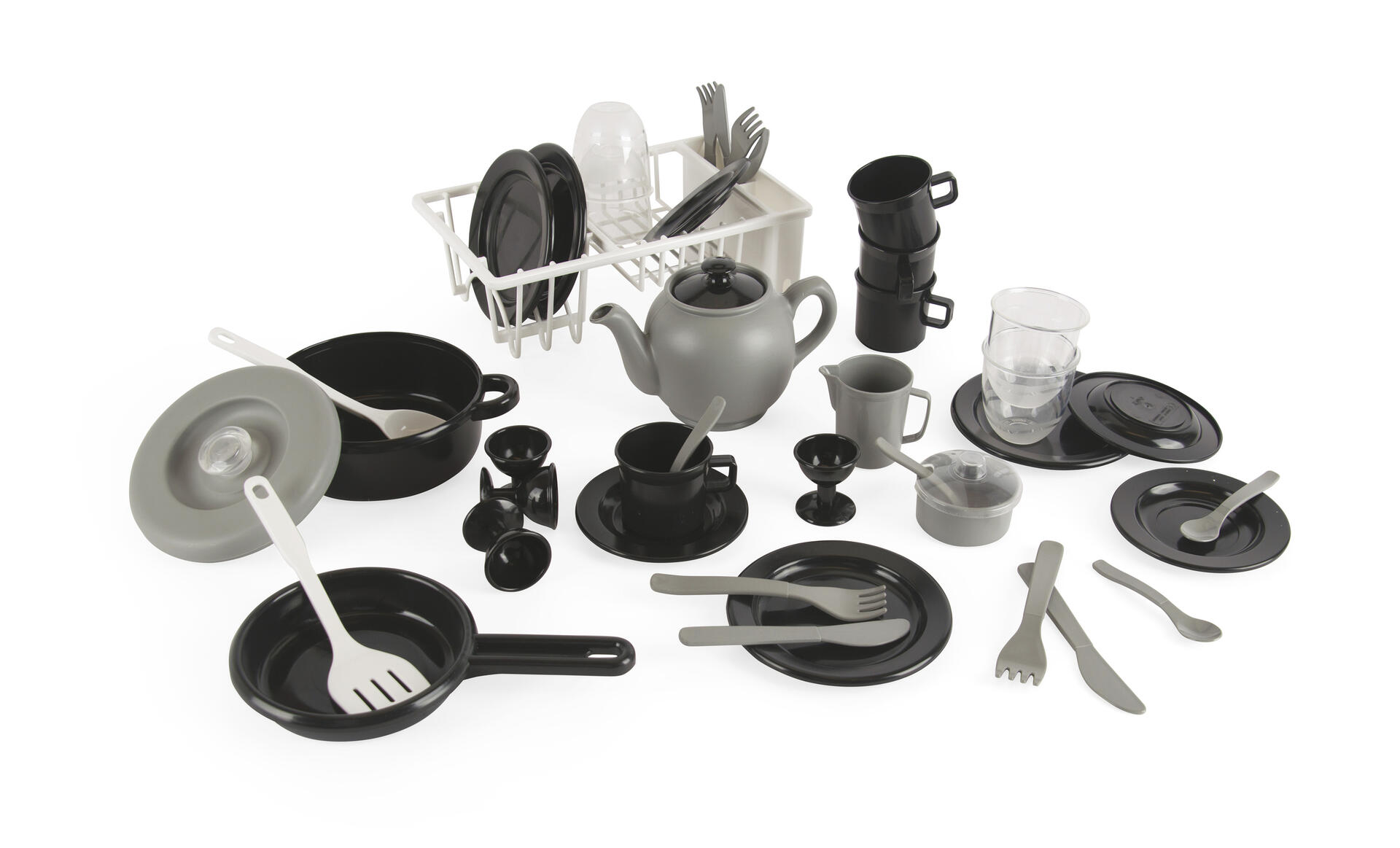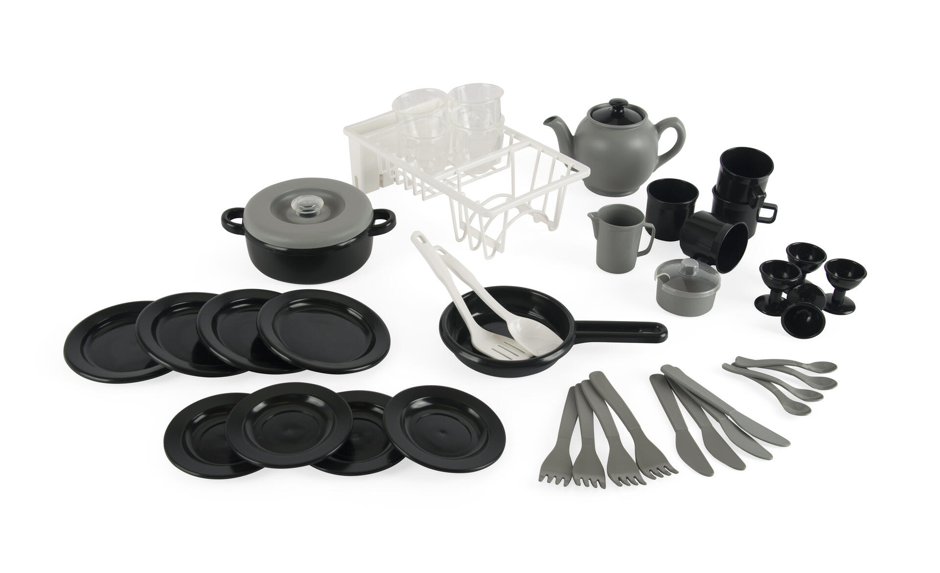 En frukost- och lunchservis i moderna färger. Innehåller 4 tallrikar med bestick, 4 glas, 4 äggkoppar, 4 kaffekoppar med assietter och teskedar, kaffekanna, mjölkkanna, sockerkopp, stekpanna, stekspade, gryta med lock och diskställ. Tål maskindisk. Av livsmedelsgodkänd PE. Mått på diskställ 24x19 cm, tallrik ø 13,5 cm och stekpanna 20,5 cm. Svanenmärkt, licensnummer 50950001. PVC-fri. Från 1 år.