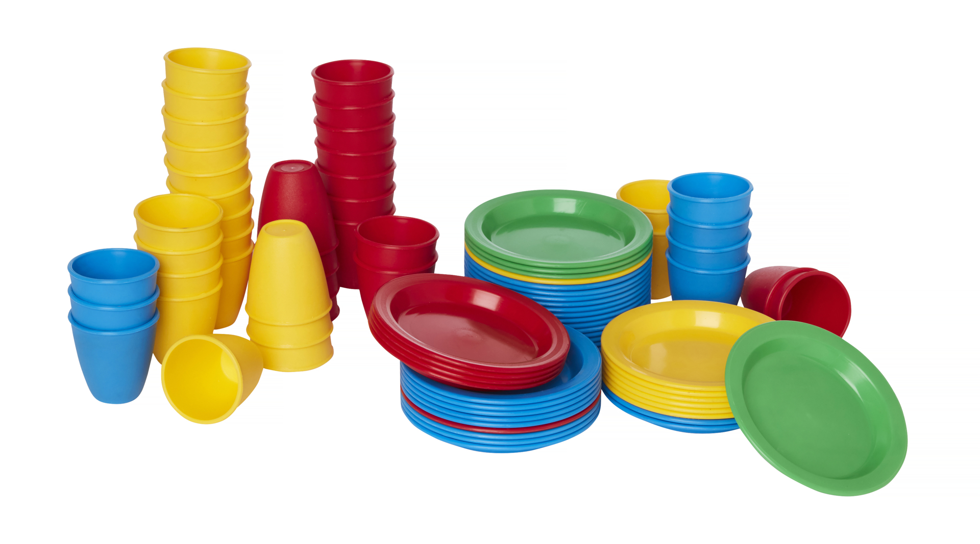 Innehåller en komplett servis för 4 personer med tallrikar, assietter, bestick, kaffekoppar, kanna, stekpannor mm. Av livsmedelsgodkänd PE. Svanenmärkt, licensnummer 50950001. PVC-fri. Från 2 år