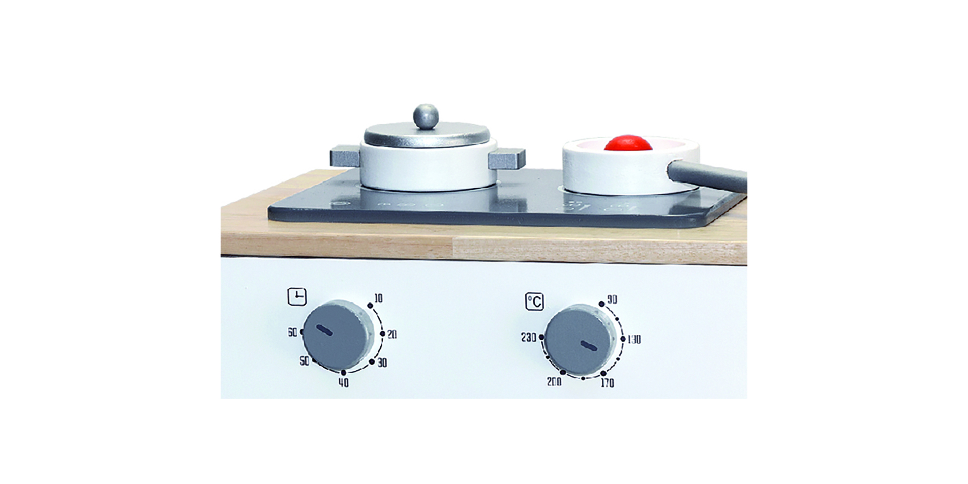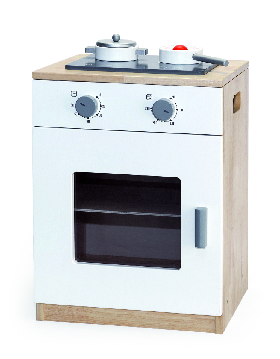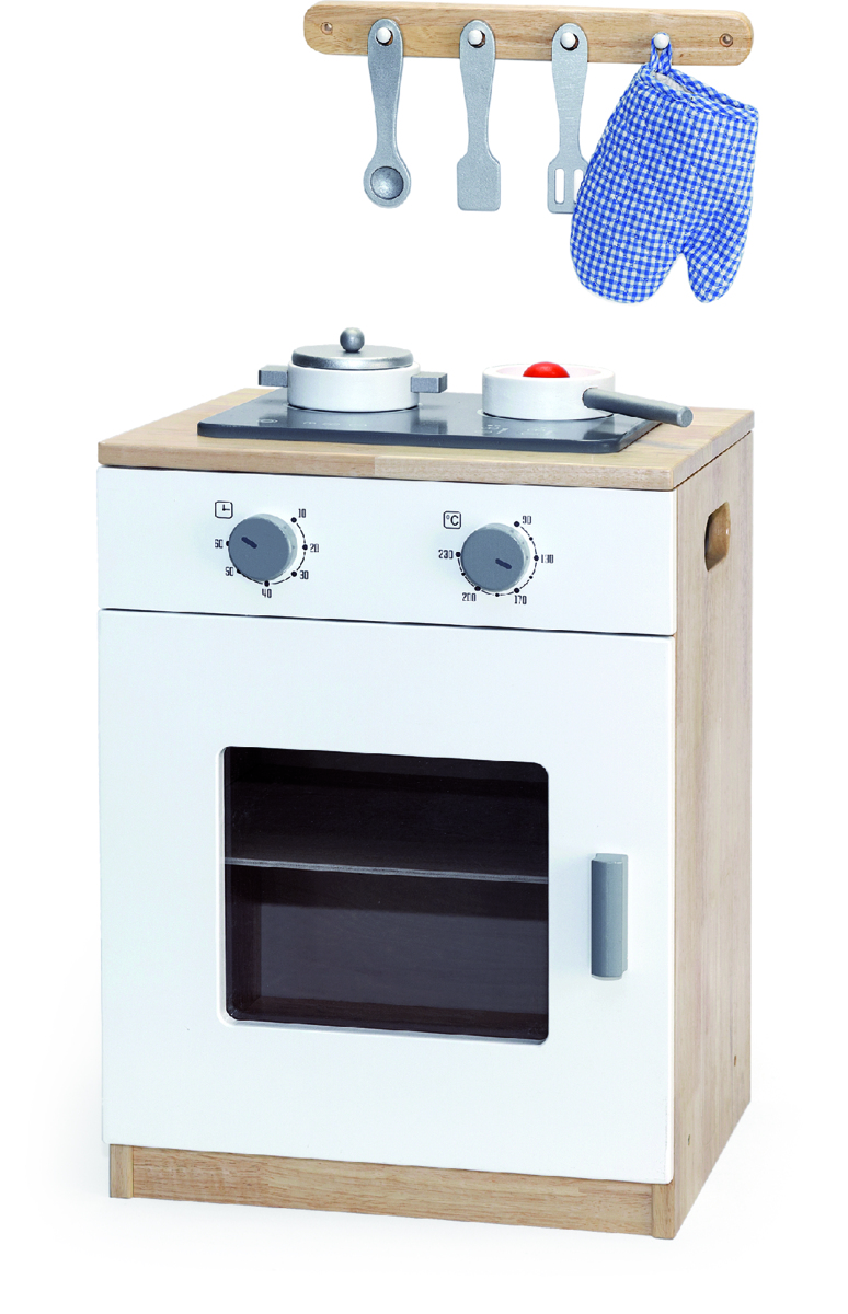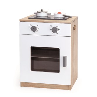 Spis som har 2 knappar för tid och värme. Ugnsluckan är genomskinlig. Luckan öppnas och stängs enkelt. Medföljande tillbehör som gryta, panna och spatel. Levereras omonterad. Ska förankras i vägg. Mått: 55x40x36 cm. Hängare är 34 cm lång. Av FSC-märkt plywood och trä. PVC-fri. Från 3 år.
