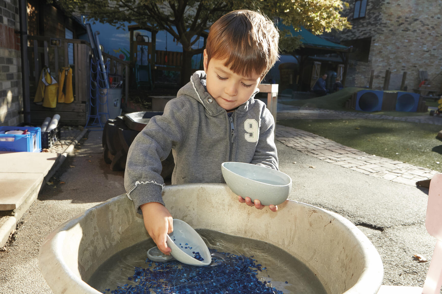 Praktiska baljor och kärl som enkelt kan placeras och flyttas runt i utemiljön. Används till att samla material, till rollekar eller till lek med vatten och lera. Innehåller 3 burkar i olika storlekar (den största: ø 18 cm) och 3 baljor i olika storlekar (den största: ø 26 cm). Tillverkade av galvaniserad metall. PVC-fri. Från 3 år.
