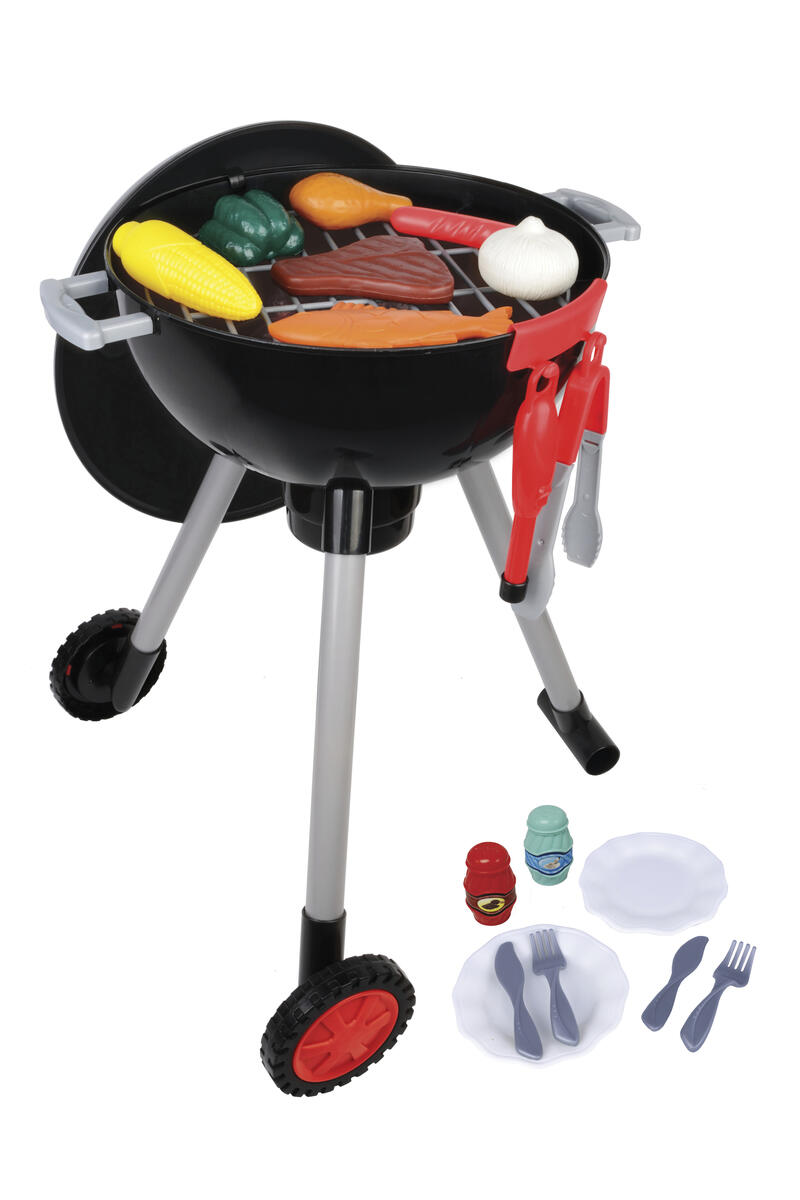 22 delar. Fin leksaksgrill med många tillbehör. Innehåller bland annat leksaksmat, grillkol, tändare, grillgaller, tång samt tallrikar och bestick. Utrustad med ljus- och ljudfunktion. 2 st AA-batterier (R6) krävs, ingår ej. Mått: 51x51x63 cm. Från 3 år.