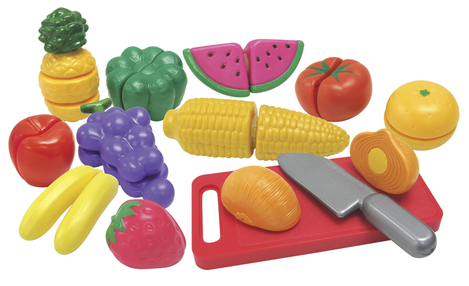 13 st/fp. Matcha de 11 frukterna och grönsakerna med varandra och träna motoriken genom att dela dem med plastkniven. Kardborre mellan delarna. Skärbräda och kniv ingår. Från 3 år.