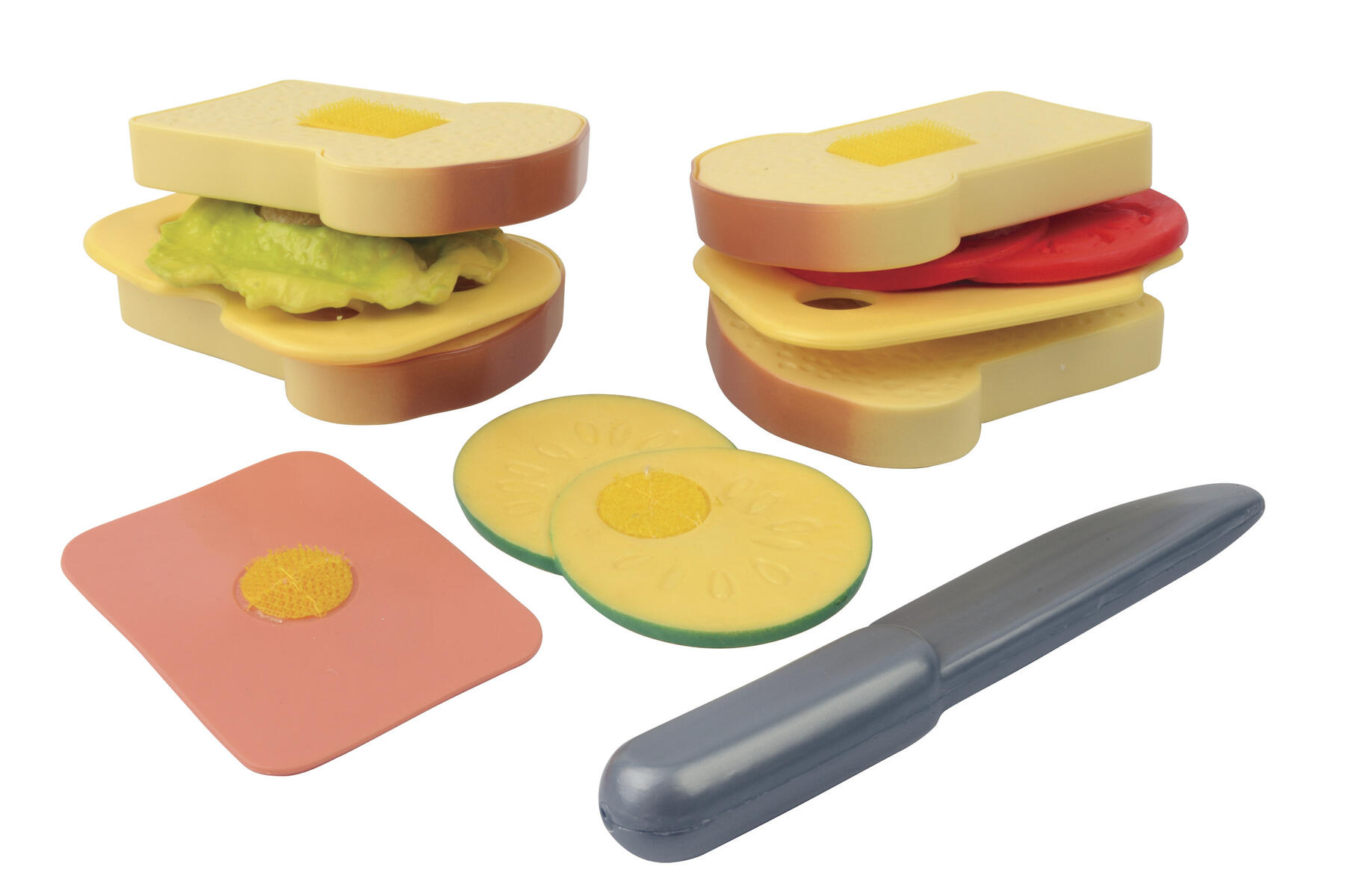 18 delar/fp. Gör mumsiga smörgåsar med olika pålägg och träna motoriken genom att dela dem med kniv. Kardborre mellan delarna. Matsetet innehåller 6 skivor bröd, skinka, salami, ägg, gurka, tomat, sallad och en plastkniv. Från 3 år.