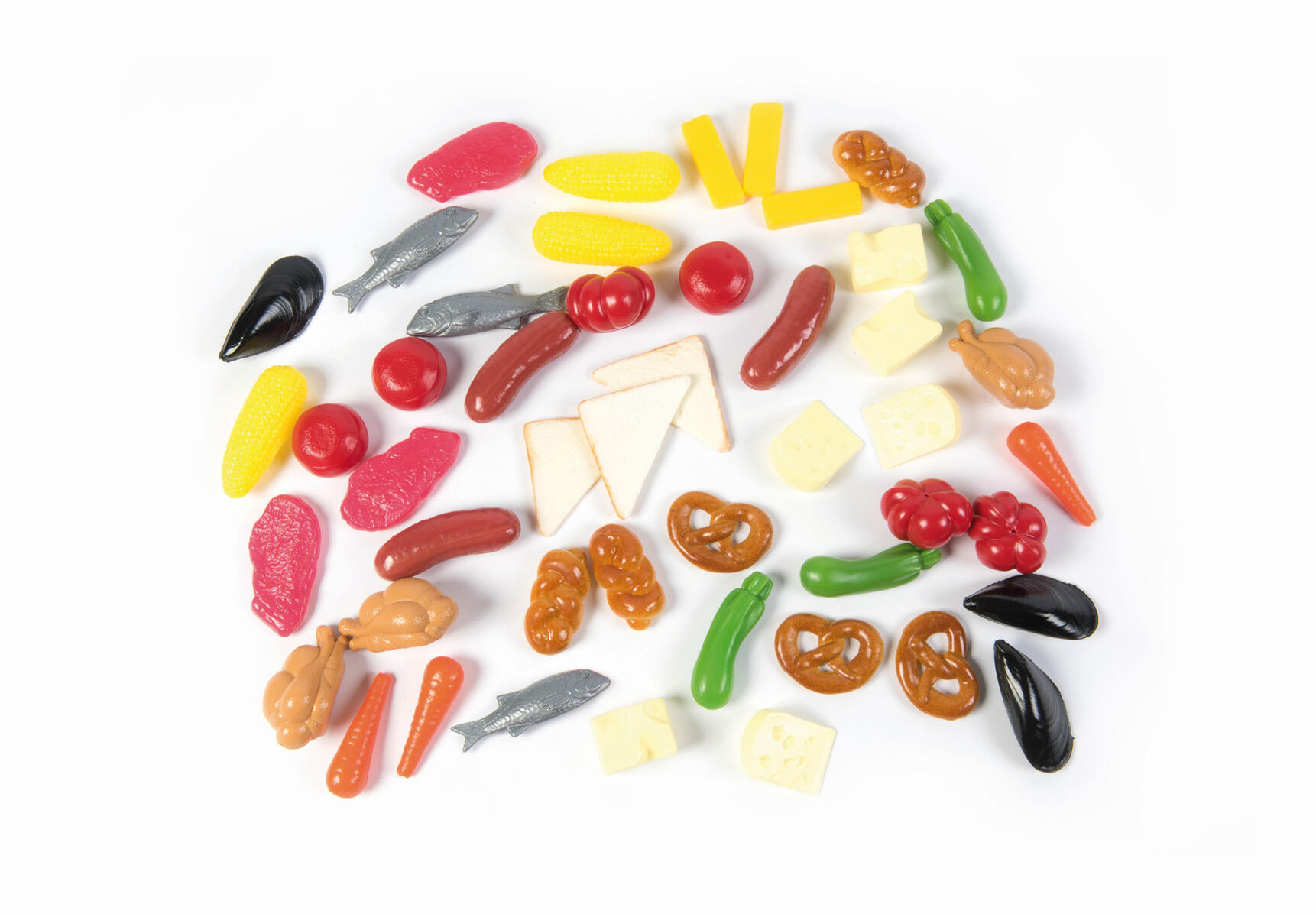 48 delar. Blandade matvaror med olika grönsaker, kött, fisk, bröd och ost. Ej naturlig storlek, mått varierar mellan 3,5-11 cm. Av PE. PVC-fri. Från 2 år.