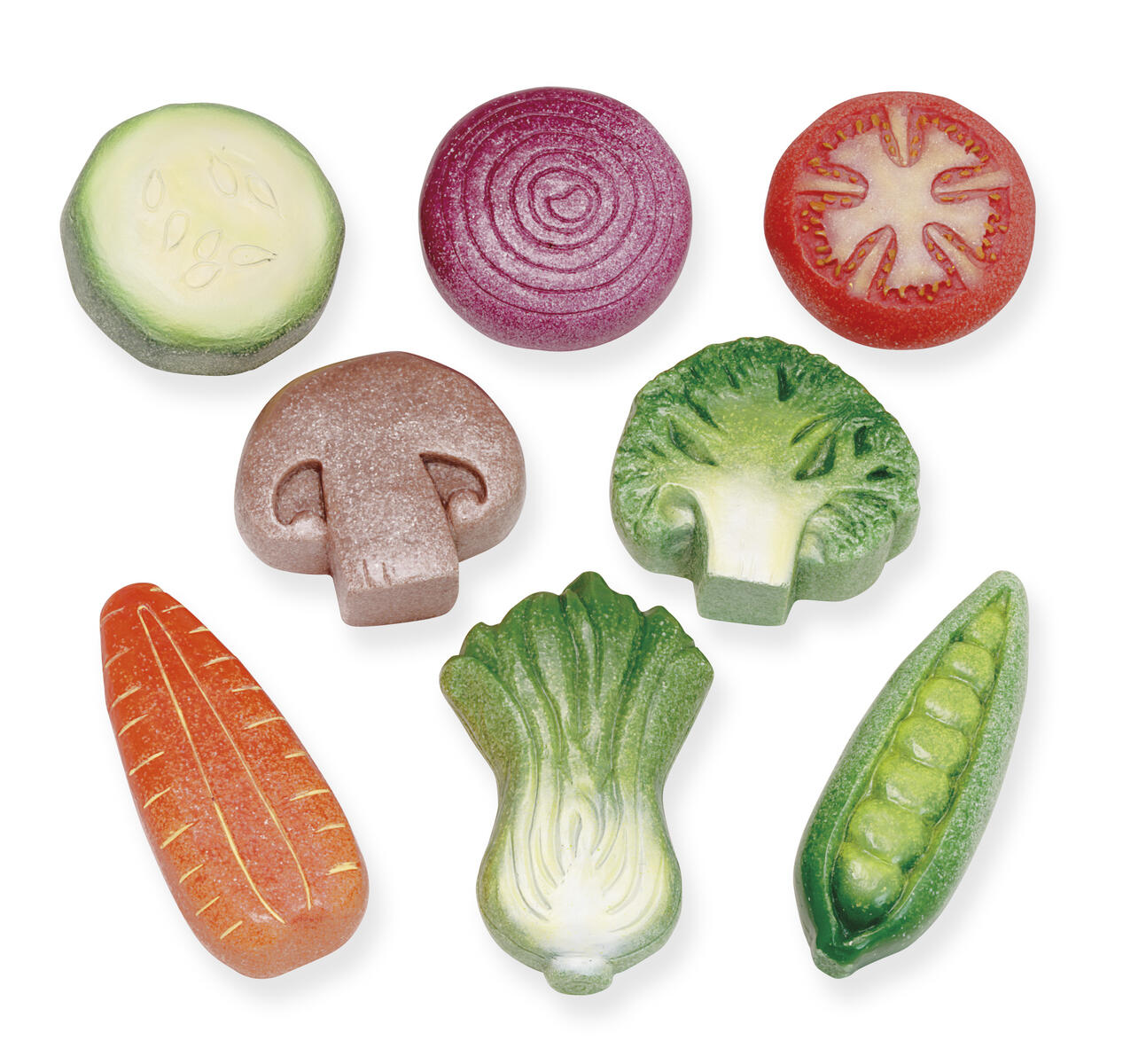 8 st/fp. Robusta grönsaker av sten för kreativ matlagning i lerköket. Fungerar lika bra inomhus som utomhus. Innehåller tomat, pak choi, lök, ärtor, morot, svamp, gurka och broccoli. Mått: 5-8 cm. PVC-fri. Från 2 år.
