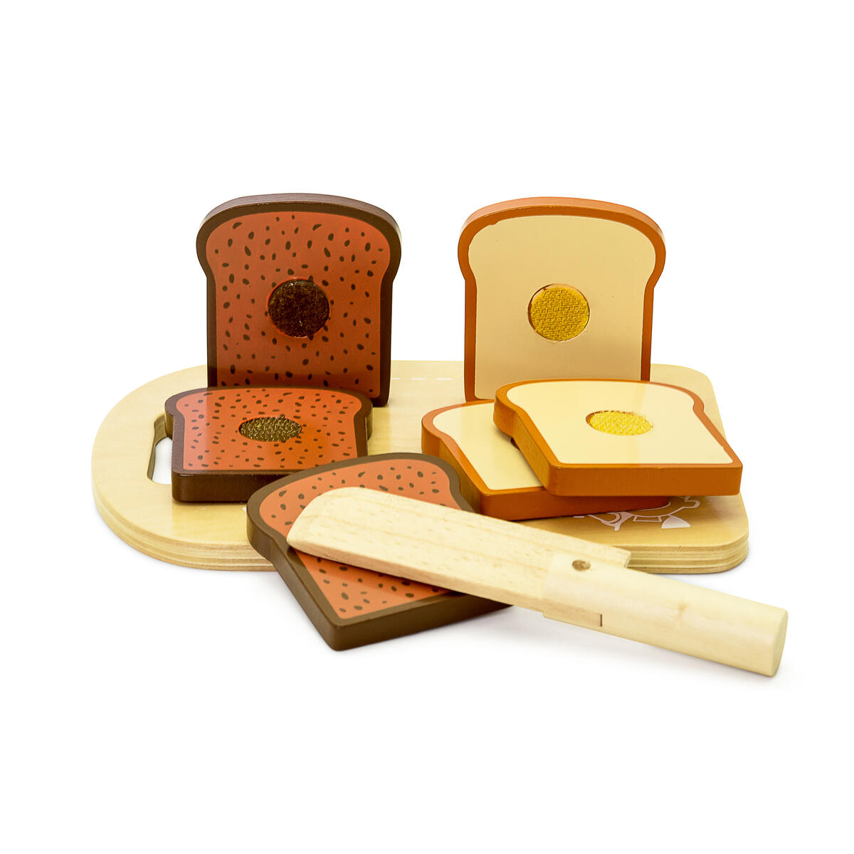8 delar/fp. Skärbräda med delbart bröd och brödkniv. 6 brödskivor med kardborre mellan delarna. Av FSC-märkt trä. Skärbrädans mått är 19x13 cm. PVC-fri. Från 2 år.