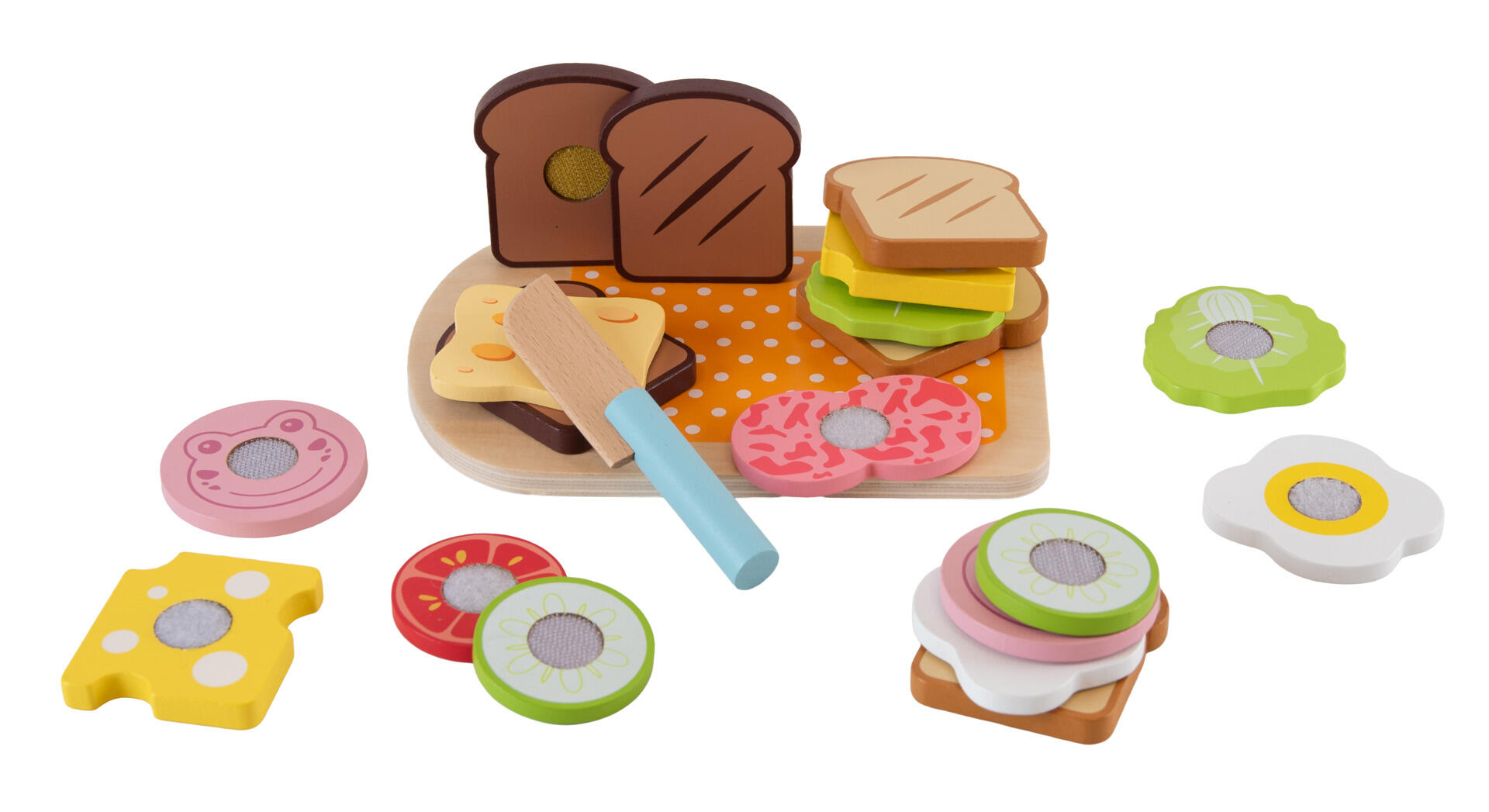 20 delar/fp. Gör en mumsig smörgås med hjälp av detta set med delbart bröd, pålägg, skärbräda och brödkniv. Innehåller 6 brödskivor och 12 smörgåspålägg med kardborre mellan delarna. Setet innehåller korv, ägg, ost och andra favoriter. Alla delar är av FSC-märkt trä. Skärbrädans mått är 19x13 cm. PVC-fri. Från 2 år.