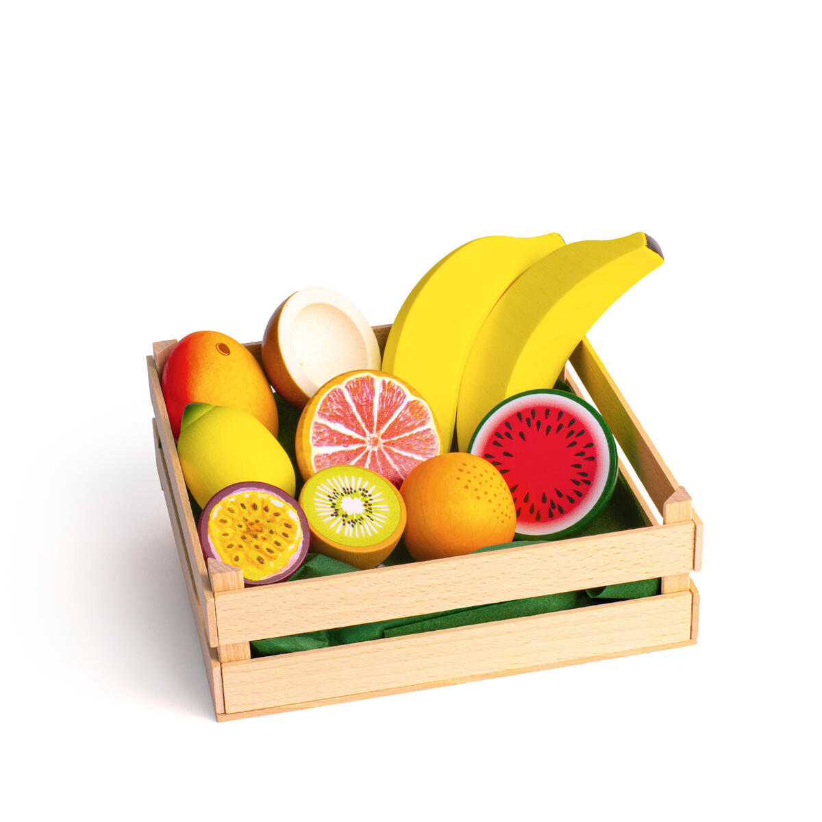 5 färgglada lådor fyllda med 20 frukter och grönsaker i likadana färger som sin tillhörande låda. Barnen kan träna på att sortera efter färg, form och storlek. Med 2 snören så att barnen kan träna motorik genom att trä frukterna och grönsakerna på snöret. Av FSC-märkt trä. PVC-fri. Från 3 år.