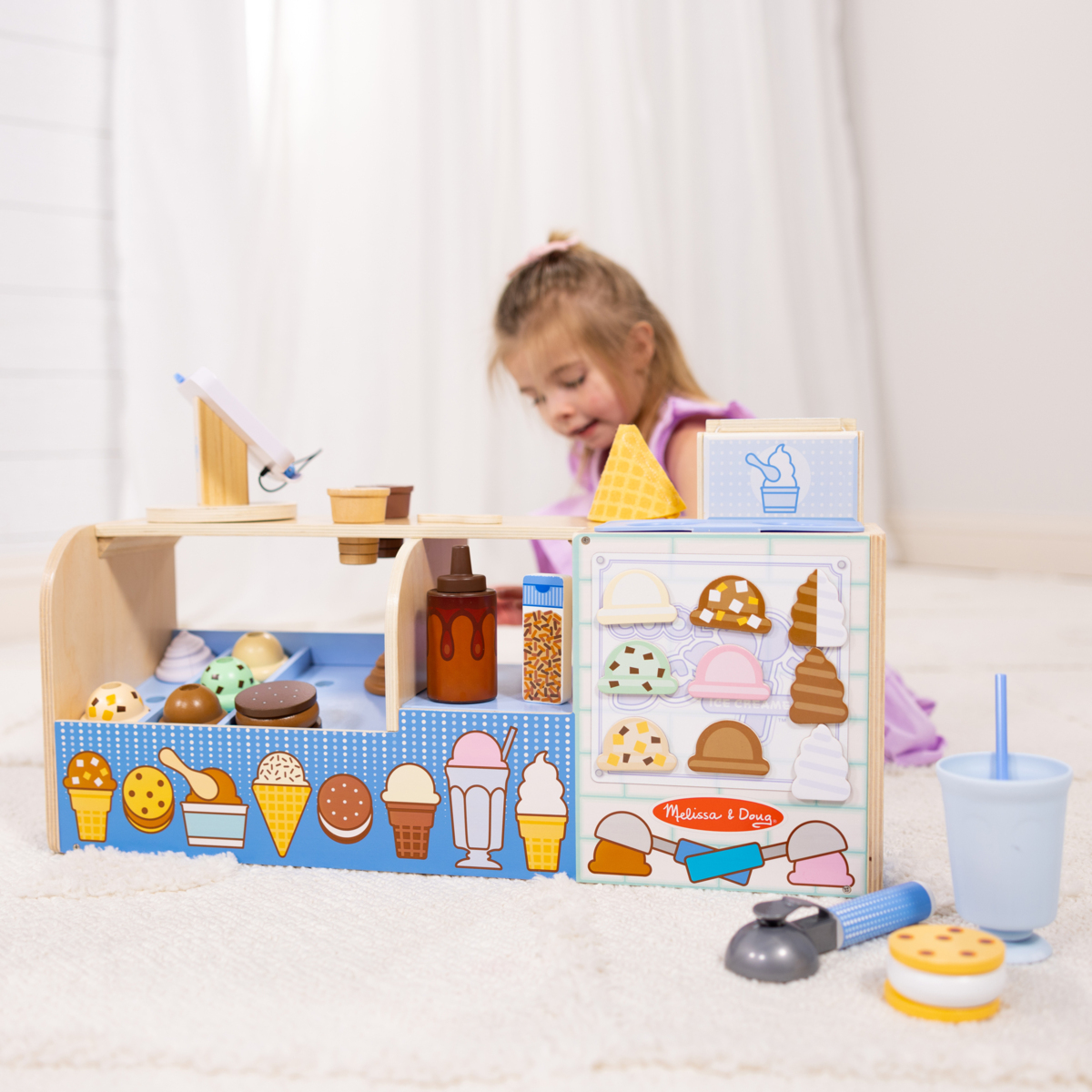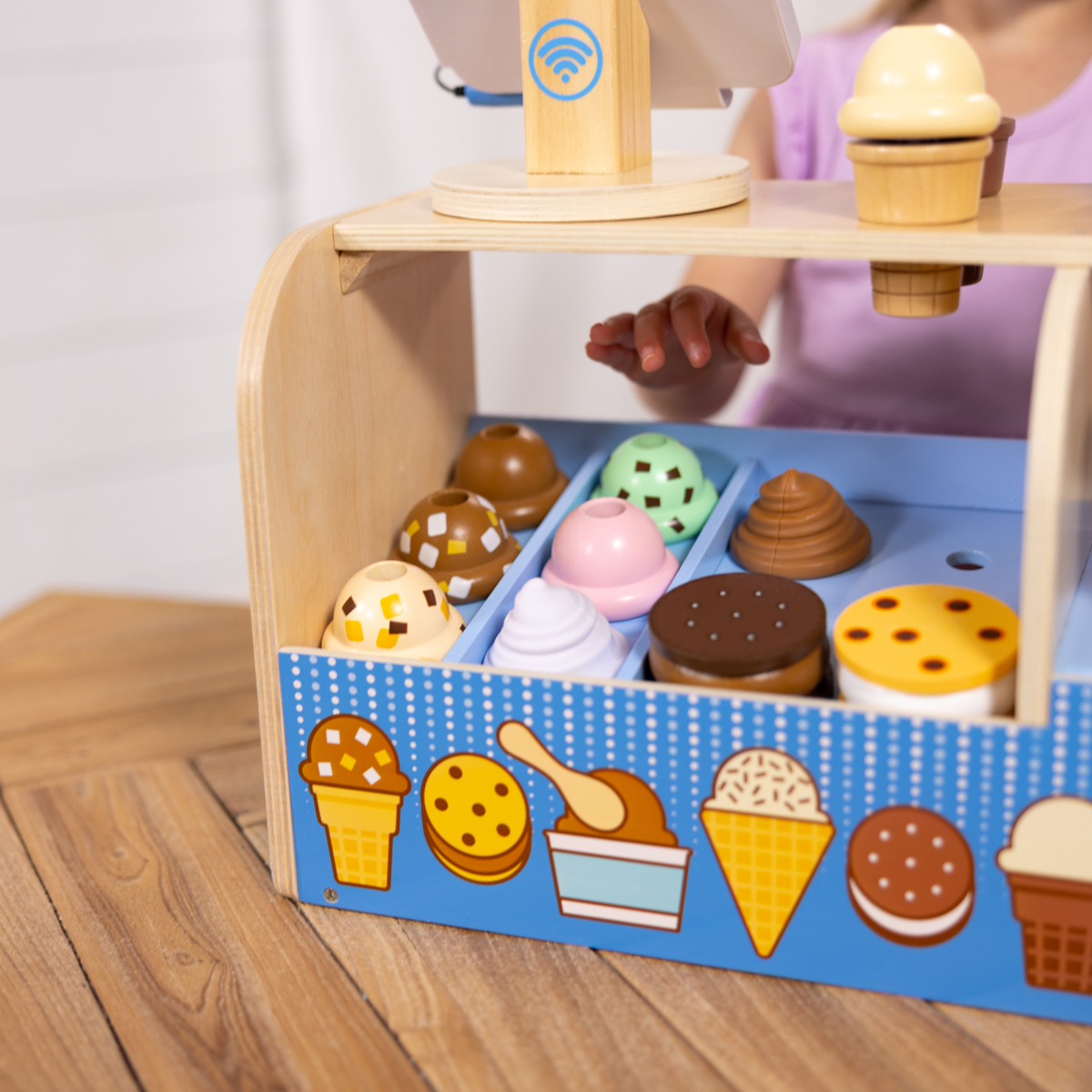 Precis som en riktig kassaapparat medföljer skanner, kreditkortsläsare, kvittorulle, kreditkort och några mynt. Mått: 18,5x15,8x11 cm. Av FSC-märkt trä. PVC-fri. Från 3 år.