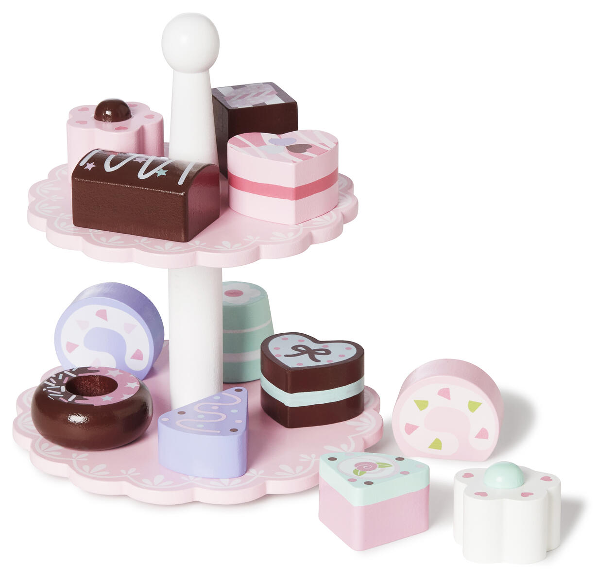 Smaskig chokladtårta med 6 bitar på en bricka. Tårtbitarna sitter ihop med kardborre som kan delas med hjälp av den medföljande träkniven. Av FSC-märkt trä. PVC-fri. Från 2 år.