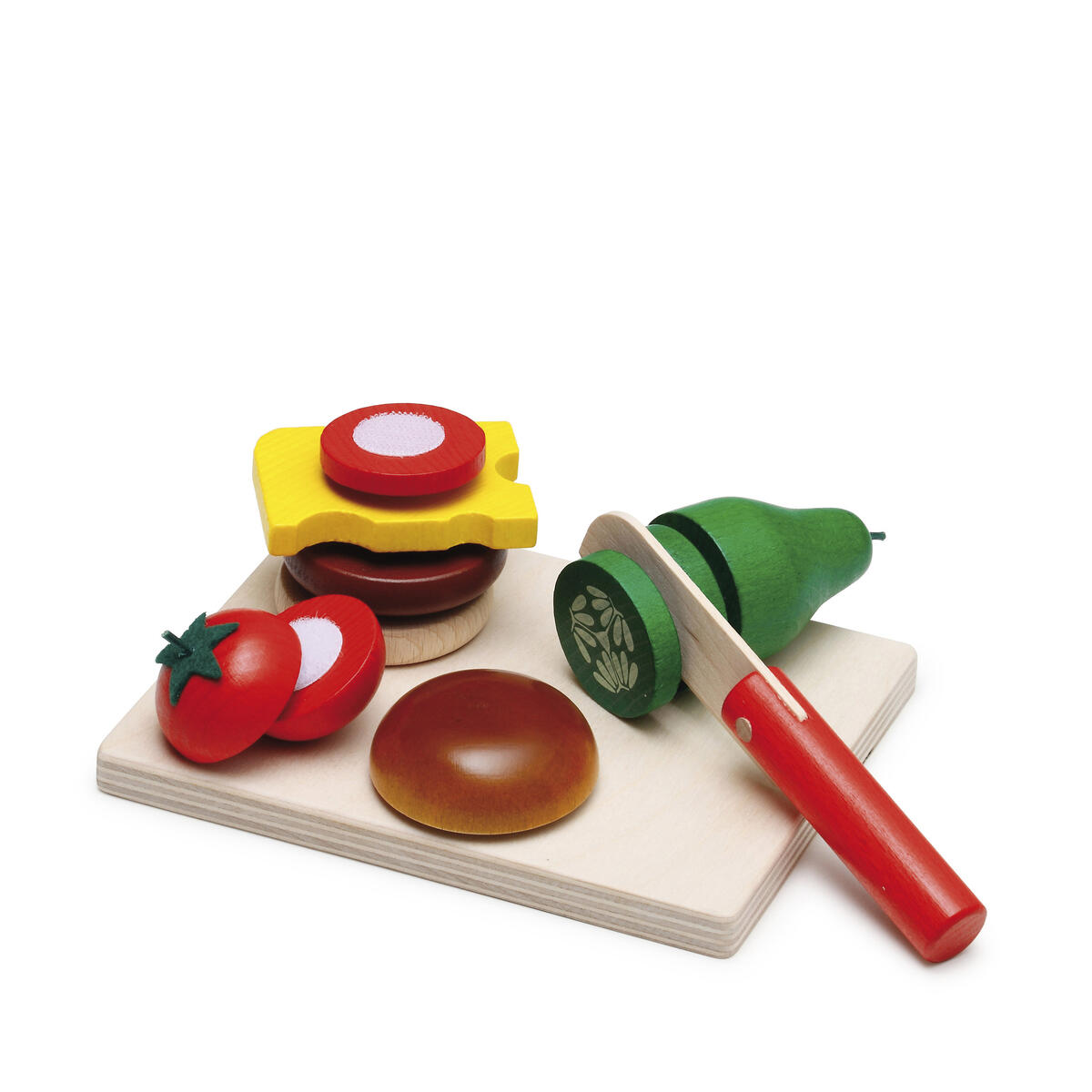 13 delar. Ett set med delbar lekmat där man bl.a. kan göra en ostburgare. Innehåller gurka, tomat, hamburgerbröd, hamburgare, ost, skärbräda och träkniv. Av FSC-märkt trä. PVC-fri. Från 3 år.