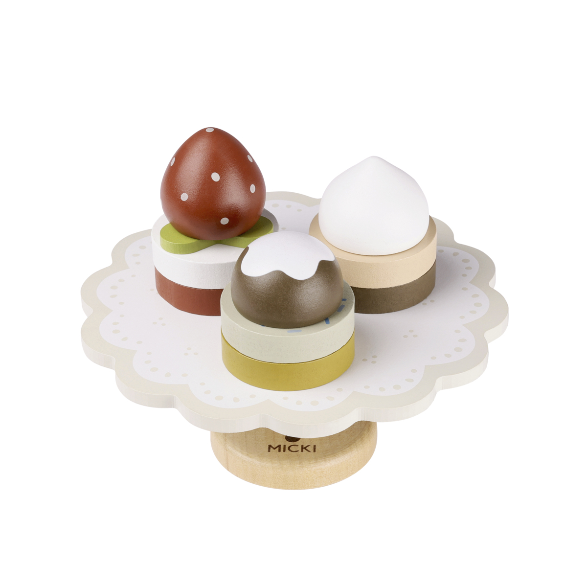 10 delar. Bygg dina egna bakelser och servera dem sedan på ett vackert kakfat. Varje bakelse innehåller tre vackert dekorerade bitar i fina färger. Mått på kakfat: 17x17x9 cm. Av FSC-märkt trä. Från 3 år.