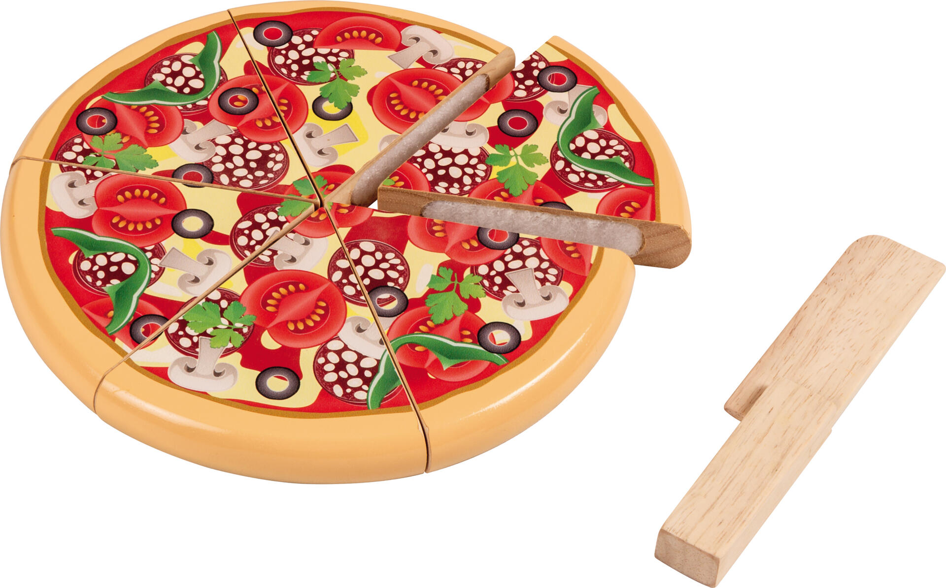 7 delar. En smaskig pizza som sitter ihop med kardborre och är delbar i 6 bitar. Kniv av trä ingår. Av FSC-märkt trä. Mått: ø 20 cm, höjd 2 cm. PVC-fri. Från 3 år.