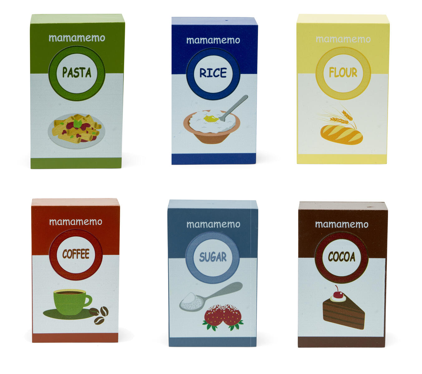 6 st/fp. Skafferivaror i trä i form av pasta, mjöl, socker, ris, kaffe och kakao. Fungerar utmärkt för rollspelslekar i köket. Alla delar är av FSC-märkt trä. Höjd per förpackning är 9 cm. PVC-fri. Från 2 år.