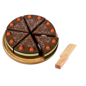 Smaskig chokladtårta med 6 bitar på en bricka. Tårtbitarna sitter ihop med kardborre som kan delas med hjälp av den medföljande träkniven. Av FSC-märkt trä. PVC-fri. Från 2 år.