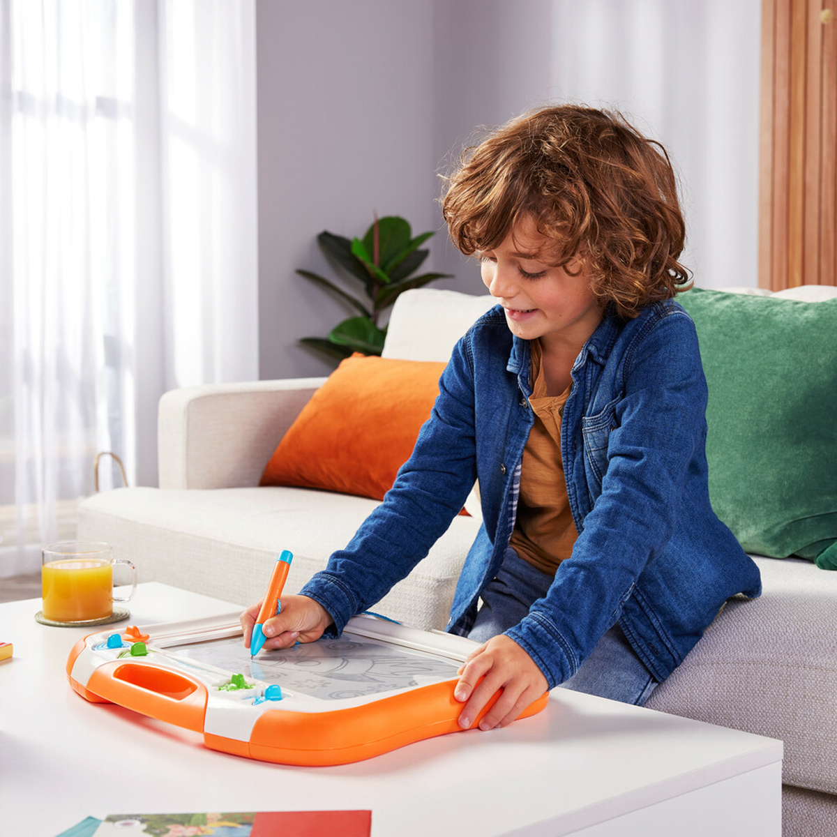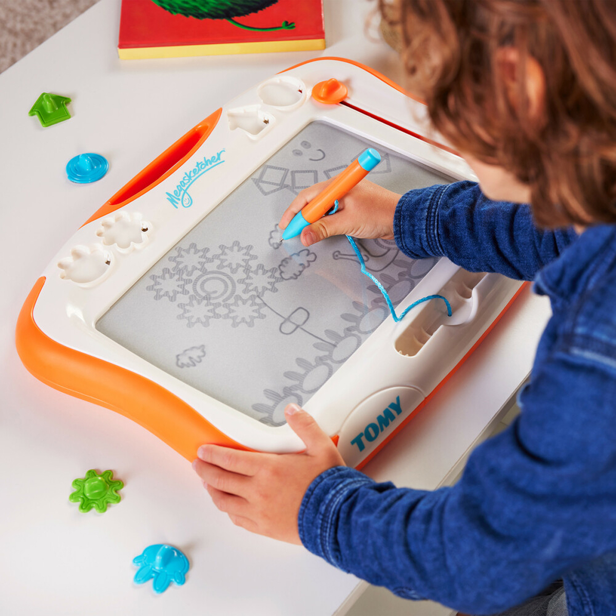 Magnetisk ritplatta med magnetpenna och 4 formstämplar med vilka man ritar, skriver meddelanden, spelar spel etc. Pennan sitter fast med ett snöre. Mått: 35x45 cm. Av PE. PVC-fri. Från 3 år.