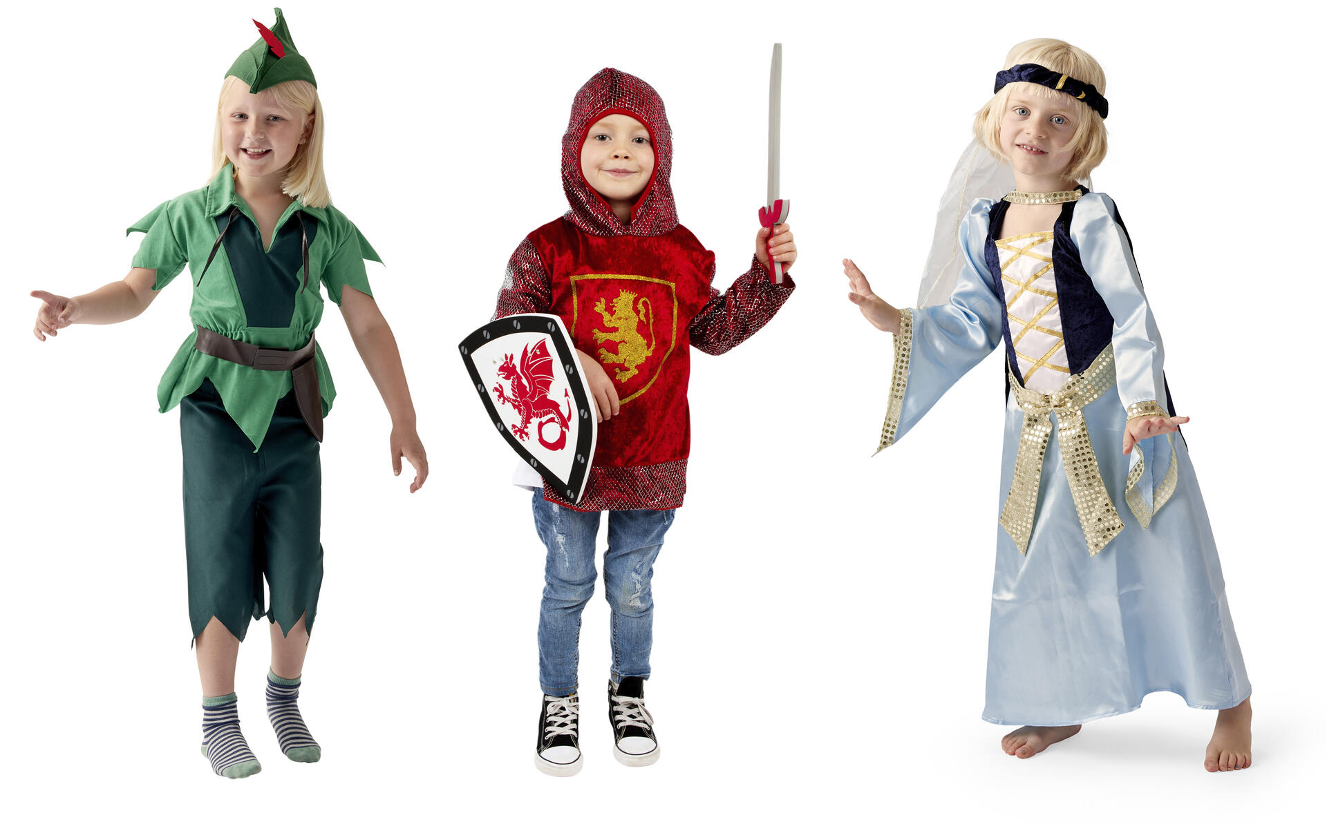 Välkommen in i sagornas värld, där prinsar och prinsessor blir verkliga. Förpackningen innehåller kungamantel, prinsjacka och byxa samt prinsessklänning. Storlek 3-5 år. Varje dräkt är av olika tygmaterial och vissa dräkter har delar av polypropen. Handtvätt. PVC-fri. Från 3 år.