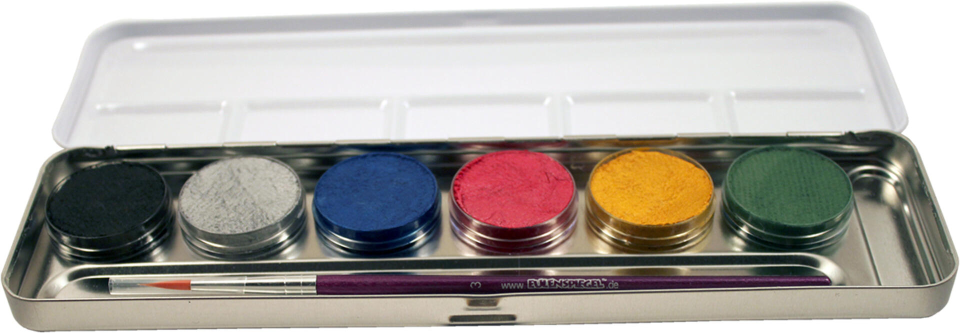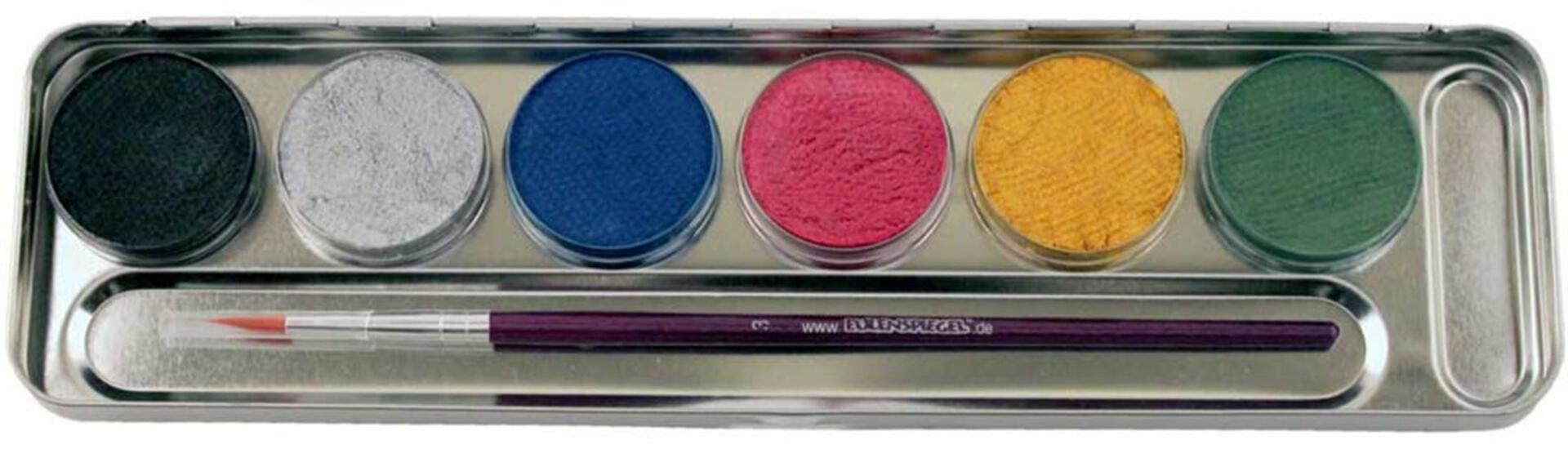 Innehåller 6 pärlemorfärger à 3,5 ml och 1 pensel som levereras i ett etui av metall. Eulenspiegel vattensminkfärger är tillverkade för både barn och proffs. Allt smink är vattenbaserat, parabenfritt, parfym- och glutenfritt samt uppfyller krav från ECR. Tvättas enkelt av med vatten och tvål. PVC-fri. Från 3 år.