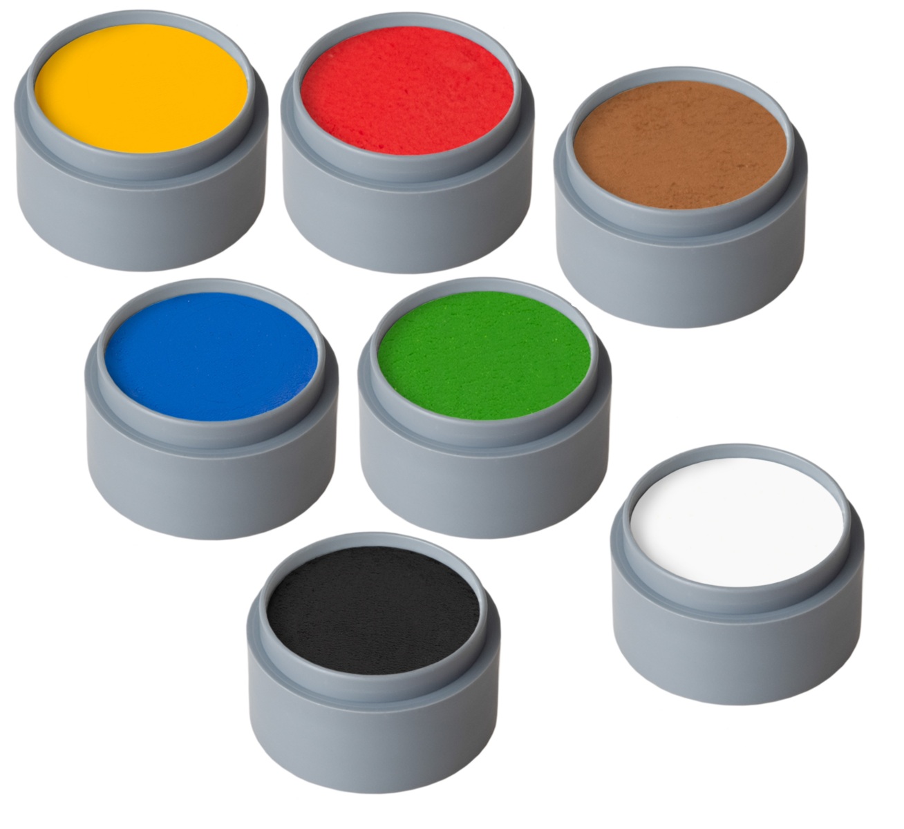 12 st/fp, innehåller två olika storlekar. Vattensminkfärger som är tillverkade för både barn och proffs. Allt smink är vattenbaserat, parabenfritt, parfym- och glutenfritt samt uppfyller krav från ECR. Tvättas enkelt av med vatten och tvål. 70 ml: två stycken vita, en svart, röd och blå. 12 ml: vit, svart, gul, röd, blå, grön och brun. PVC-fri. Från 3 år.