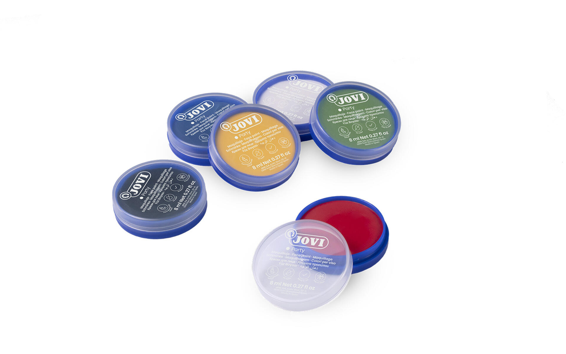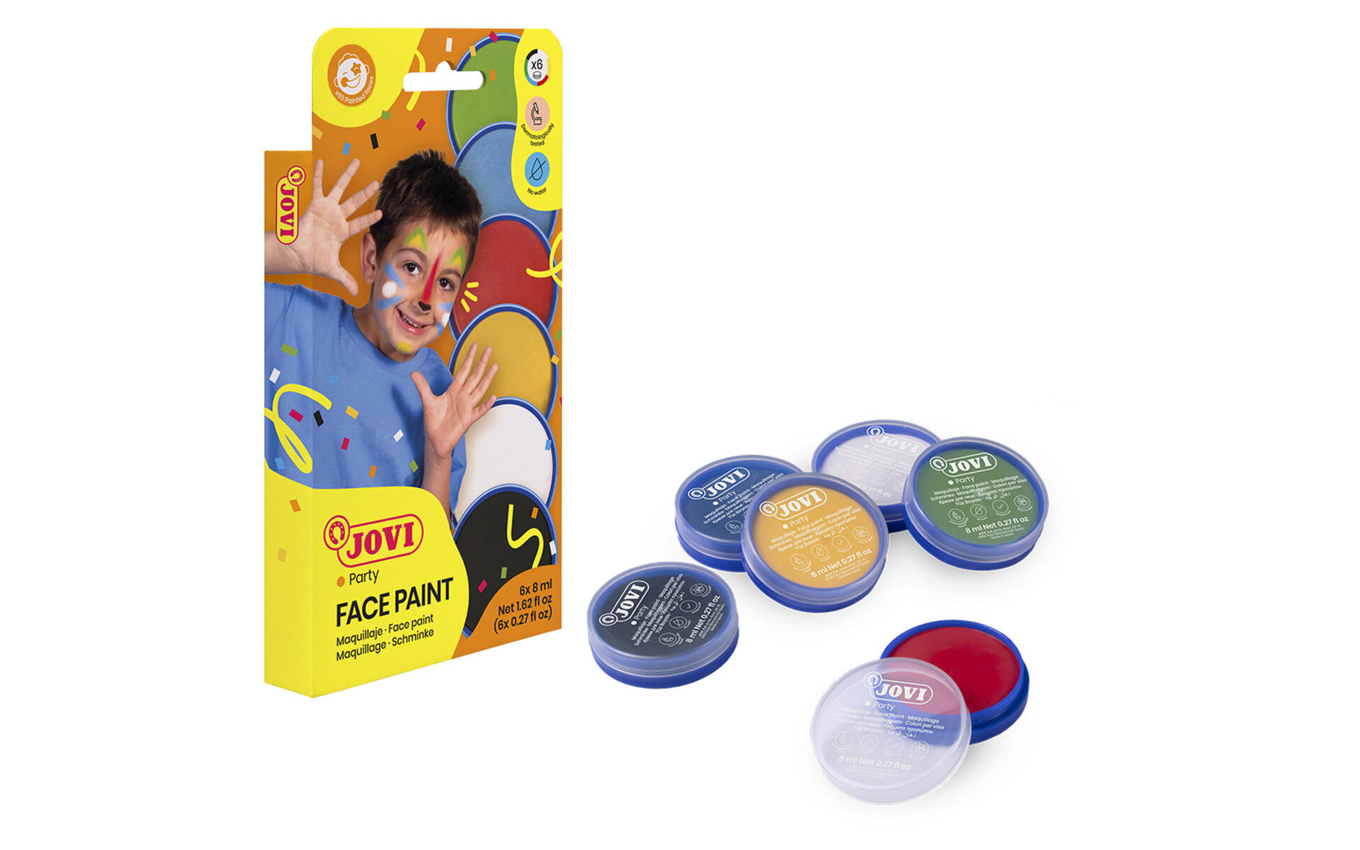 6 st/fp. Set med 6 burkar med 8 ml krämig ansiktsfärg i röd, blå, grön, gul, vit och svart. Sminket är oljebaserat och fritt från parabener. Tvättas enkelt bort med vatten och tvål eller babyolja. PVC-fri. Från 3 år.