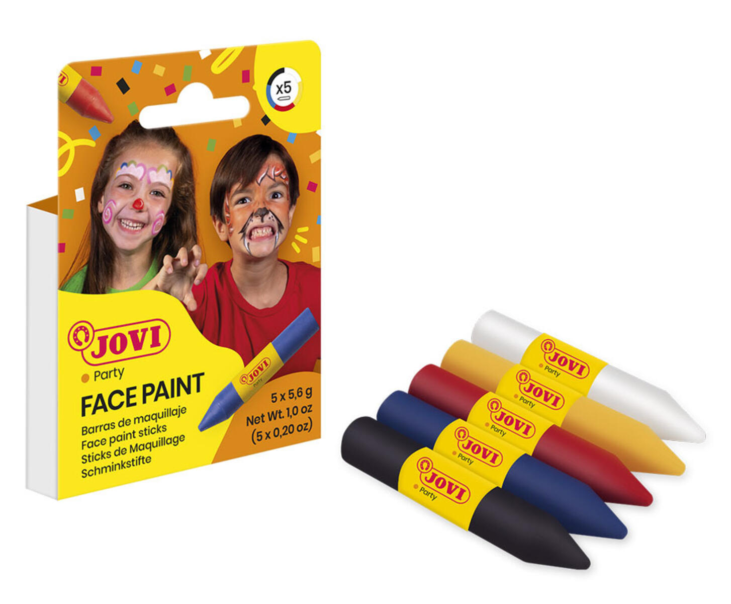 5 st/fp. Sminkkritor i färgerna svart, blå, röd, gul och vit. Varje krita väger 5,6 g. Enkel att appilicera. Sminket är oljebaserat och fritt från parabener. Tvättas enkelt bort med vatten och tvål eller babyolja. PVC-fri. Från 3 år.