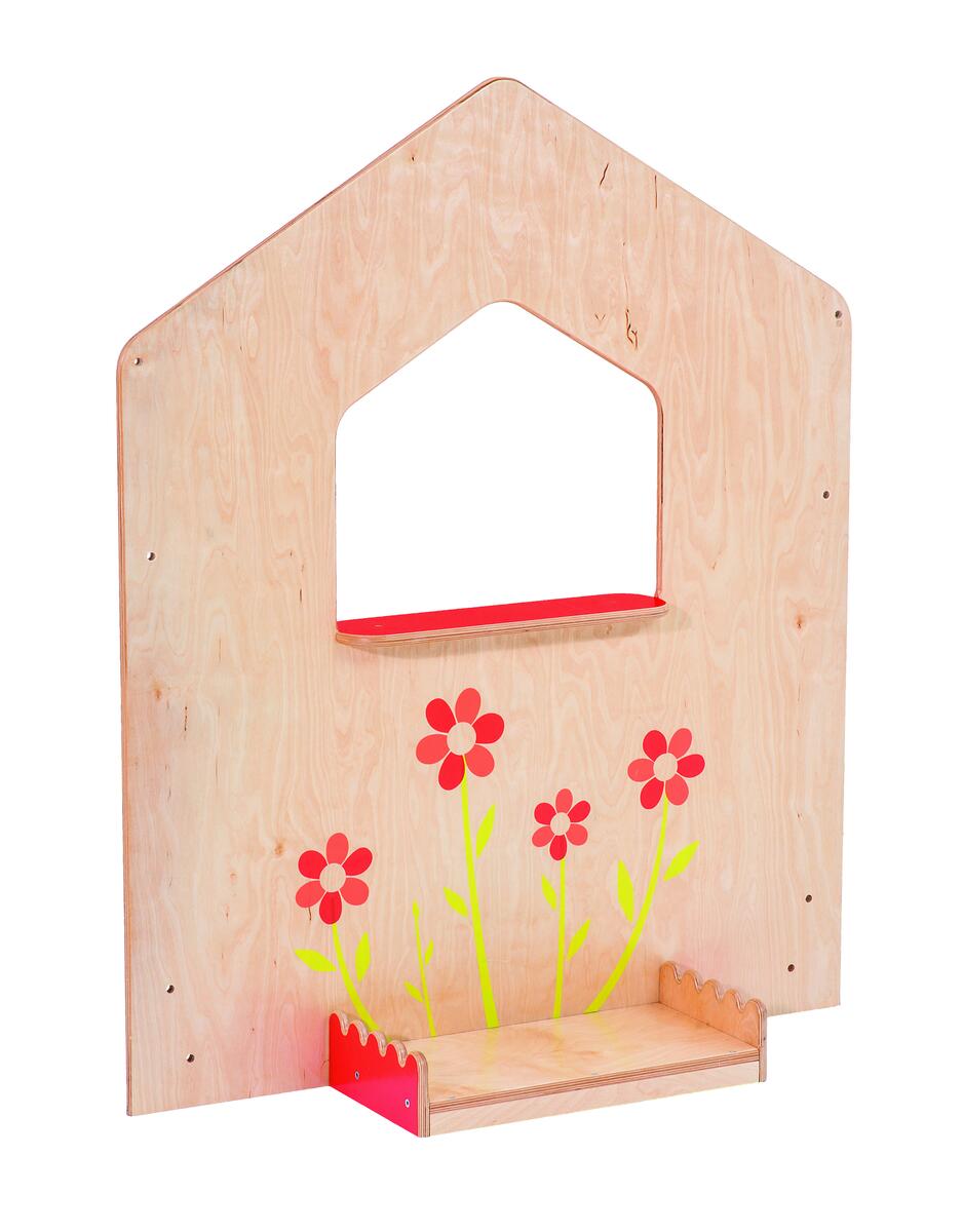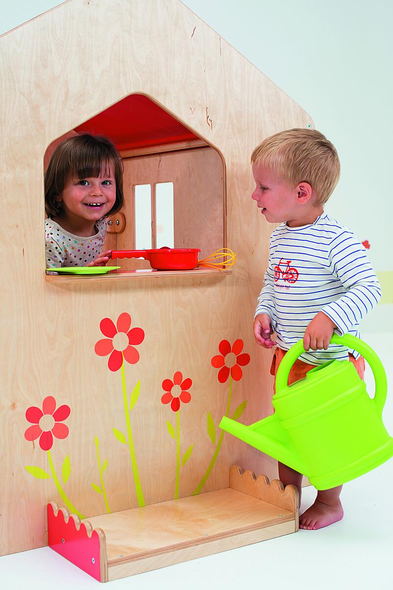 Ett roligt och originellt hus byggt av moduler som går att flytta runt i flera olika kombinationer. Perfekt för att leka affär eller imitera vardagslivet och sociala roller. I detta set ingår 1 långsida med bänk, 1 tak, 1 dörrfasad, 1 kortsida med fönster samt 1 garagefasad. Väggarna går att sätta i nittiogradiga vinklar eller rakt efter varandra för att då bl.a. kunna användas som rumsavdelare. Träfästen medföljer varje vägg. De kan även användas för att fästa konstruktionen i väggen. Väggarna är stabila även när de ställs i en rak linje efter varandra. Monteringsanvisningar medföljer. Väggarna är av 15 mm plywood. PVC-fri.