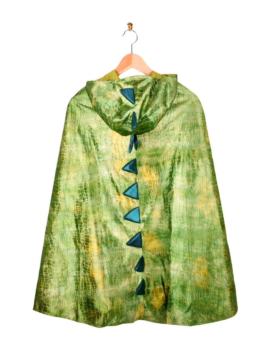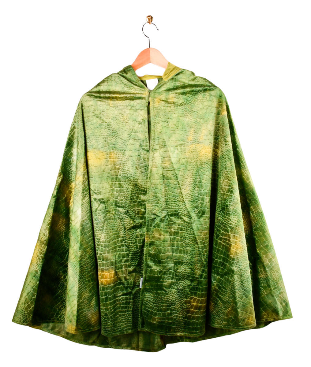 Mantel med en svart och en grön sida. Dubbelsidig mask ingår. Av Oeko-texcertifierad, klass 1 satin. Längd 70 cm. PVC-fri. Ålder 3-7 år. Fintvätt 40 °C.