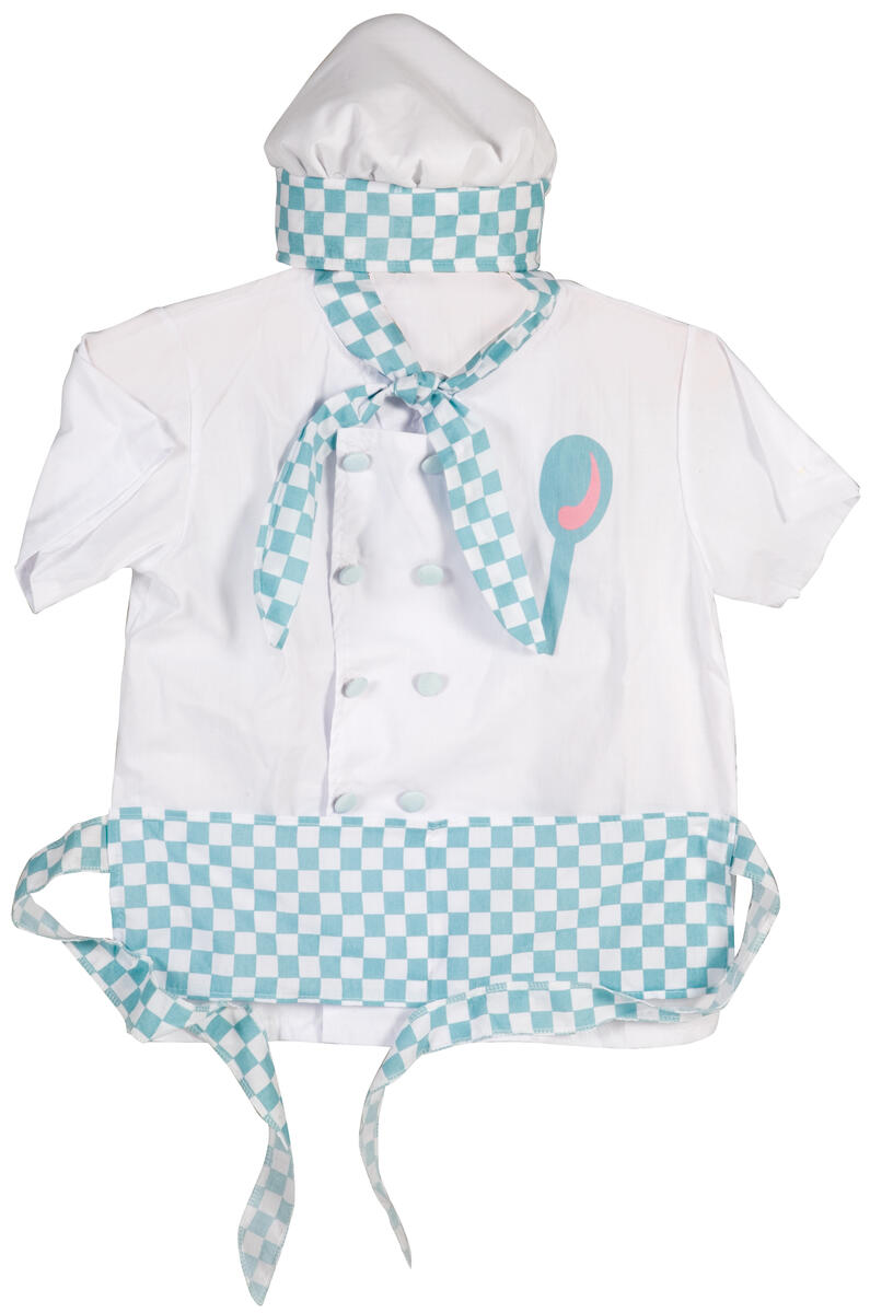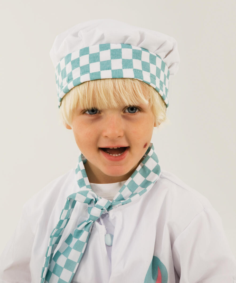 Fina kockkläder gör det roligare att leka matlagning och restaurang. Kockmössa, byxor och kockjacka med scarfdekoration. Av Oeko-texcertifierad, klass 1 polyester. PVC-fri. Lagom för åldrarna 3-6 år.