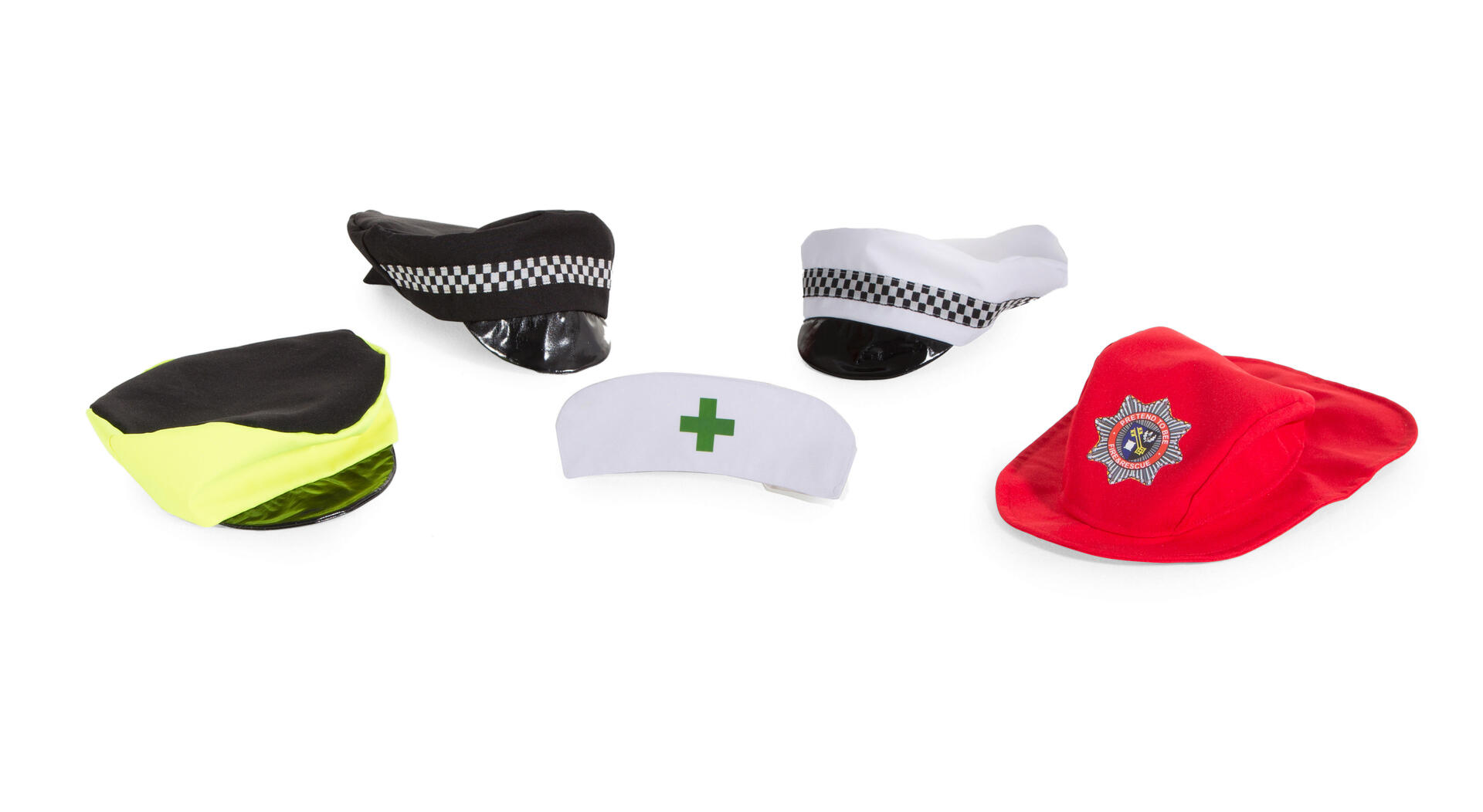 Med en hatt är det enkelt att klä ut sig och prova på en ny roll. Detta set innehåller 5 olika hattar som kan användas inom olika yrkesgrupper som t.ex. polis, brandman och sjuksköterska. Lagom för åldrarna ca 3-7 år. Av Oeko-texcertifierad, klass 1 polyester. PVC-fri.