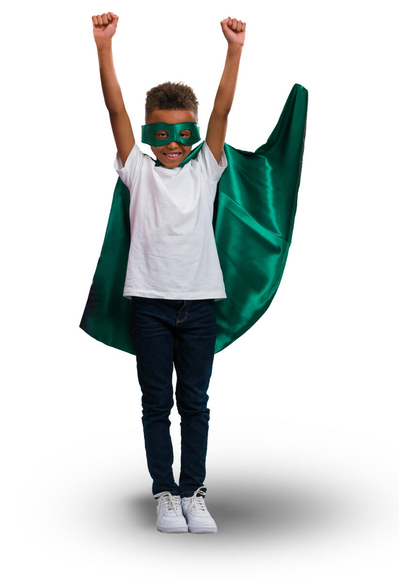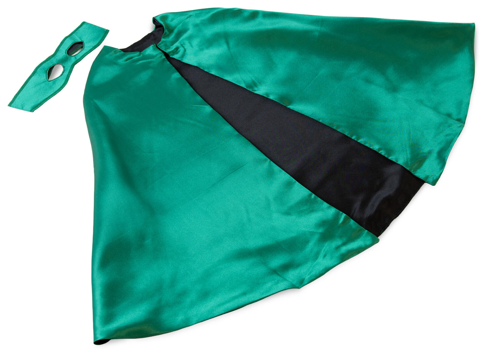 Mantel med en svart och en grön sida. Dubbelsidig mask ingår. Av Oeko-texcertifierad, klass 1 satin. Längd 70 cm. PVC-fri. Ålder 3-7 år. Fintvätt 40 °C.
