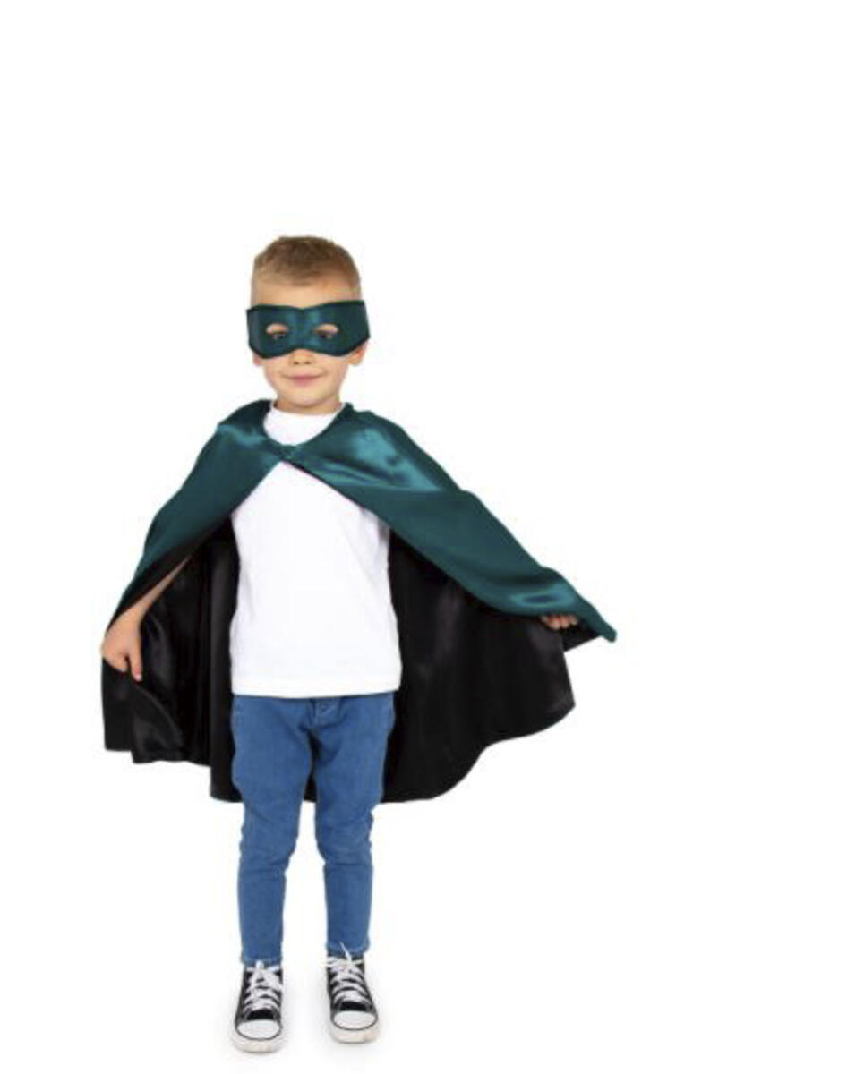 Mantel med en svart och en grön sida. Dubbelsidig mask ingår. Av Oeko-texcertifierad, klass 1 satin. Längd 70 cm. PVC-fri. Ålder 3-7 år. Fintvätt 40 °C.