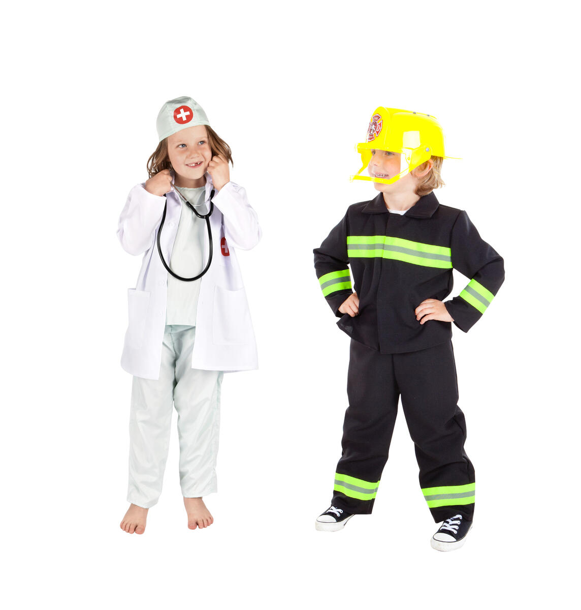 Maskeradset, brandman och doktor. Barnen ges möjlighet att leva sig in i yrkena och öva socialt samspel. Brandmansdräkten innehåller hjälm, byxor och jacka med kardborreknäppning. Doktorsdräkten innehåller byxor, mössa, linne, rock, stetoskop och icke-medicinskt munskydd. Rocken kan stängas med knäppning framtill. PVC-fri. Från 3 år.