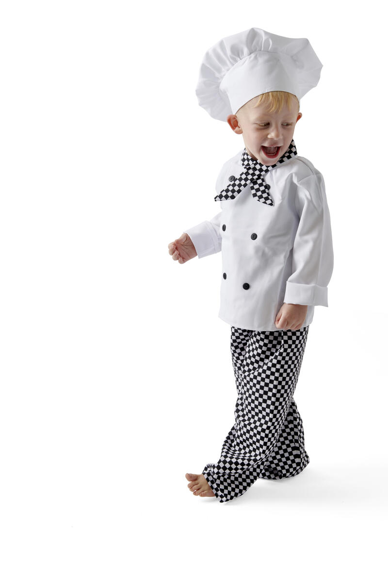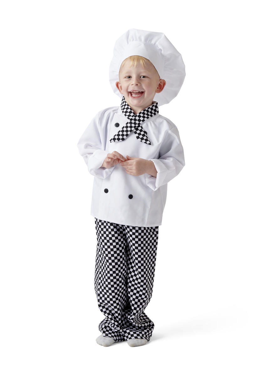 Fina kockkläder gör det roligare att leka matlagning och restaurang. Kockmössa, byxor och kockjacka med scarfdekoration. Av Oeko-texcertifierad, klass 1 polyester. PVC-fri. Lagom för åldrarna 3-6 år.