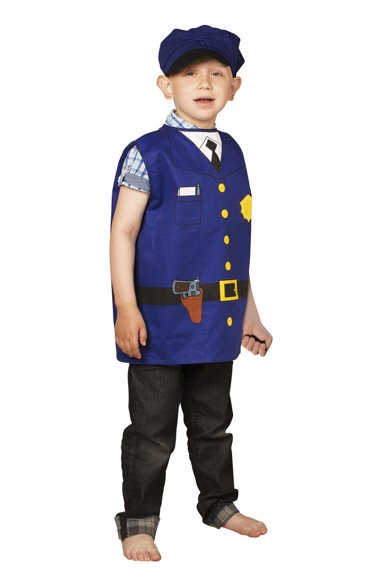 Fina kläder för den lilla polisen. Innehåller polishatt, byxor och ärmlös jacka som knäpps med dragkedja. Av Oeko-texcertifierad, klass 1 polyester. PVC-fri. Lagom för åldrarna 3-6 år.