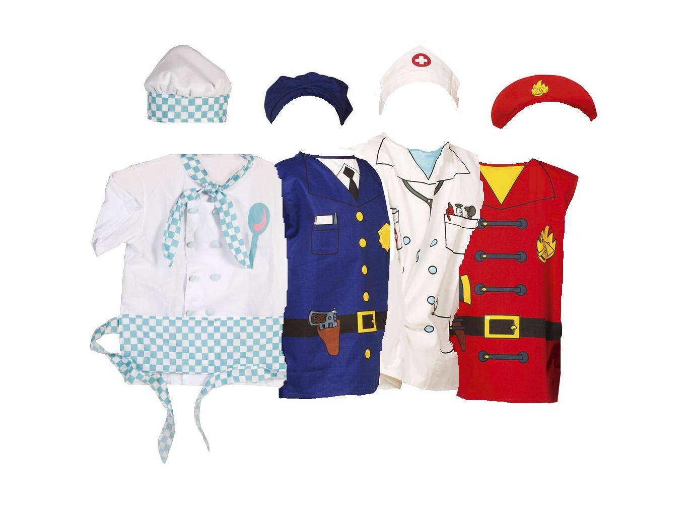Ett set med utklädnad som innehåller yrket pilot, byggare och kock. 5-7 år. Mått på kläderna: längd 122cm, midja: 54cm. Av Oeko-Texcertifierad, klass 1 polyester. PVC-fri.