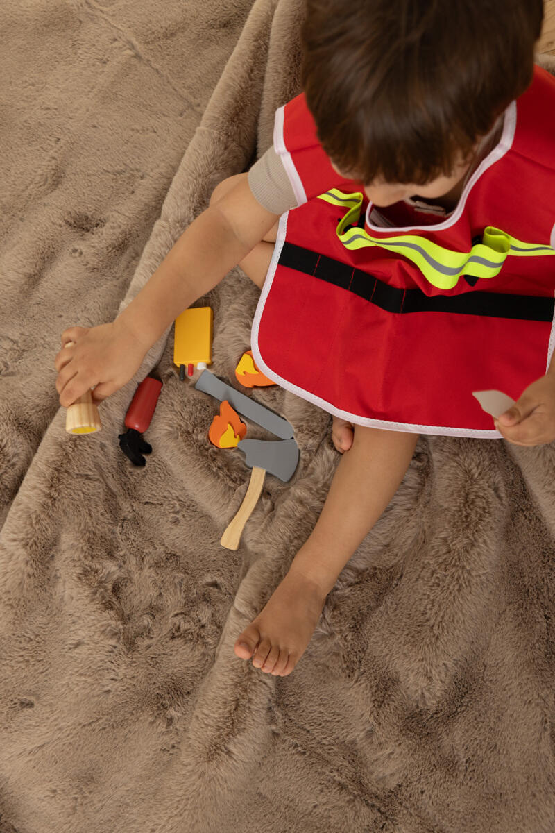 6 delar. Innehåller brandsläckare, walkie-talkie, ficklampa, brandväst samt kofot och yxa. Perfekt för fantasilek och rollspel, där barn kan utveckla empati, lagarbete och handlingsförmåga. Av polyester, bomull, FSC-märkt trä och MDF. PVC-fri. Från 3 år.