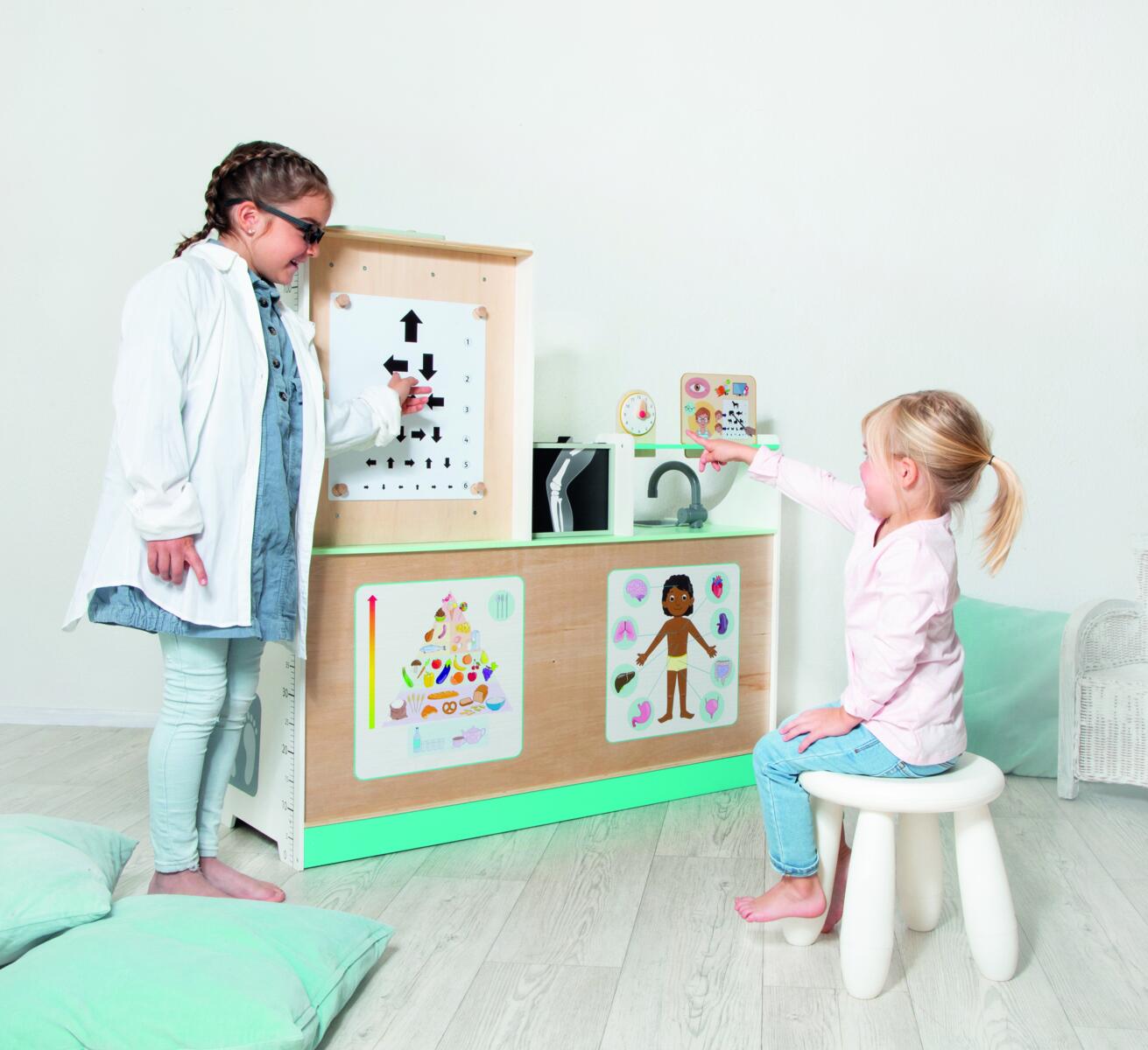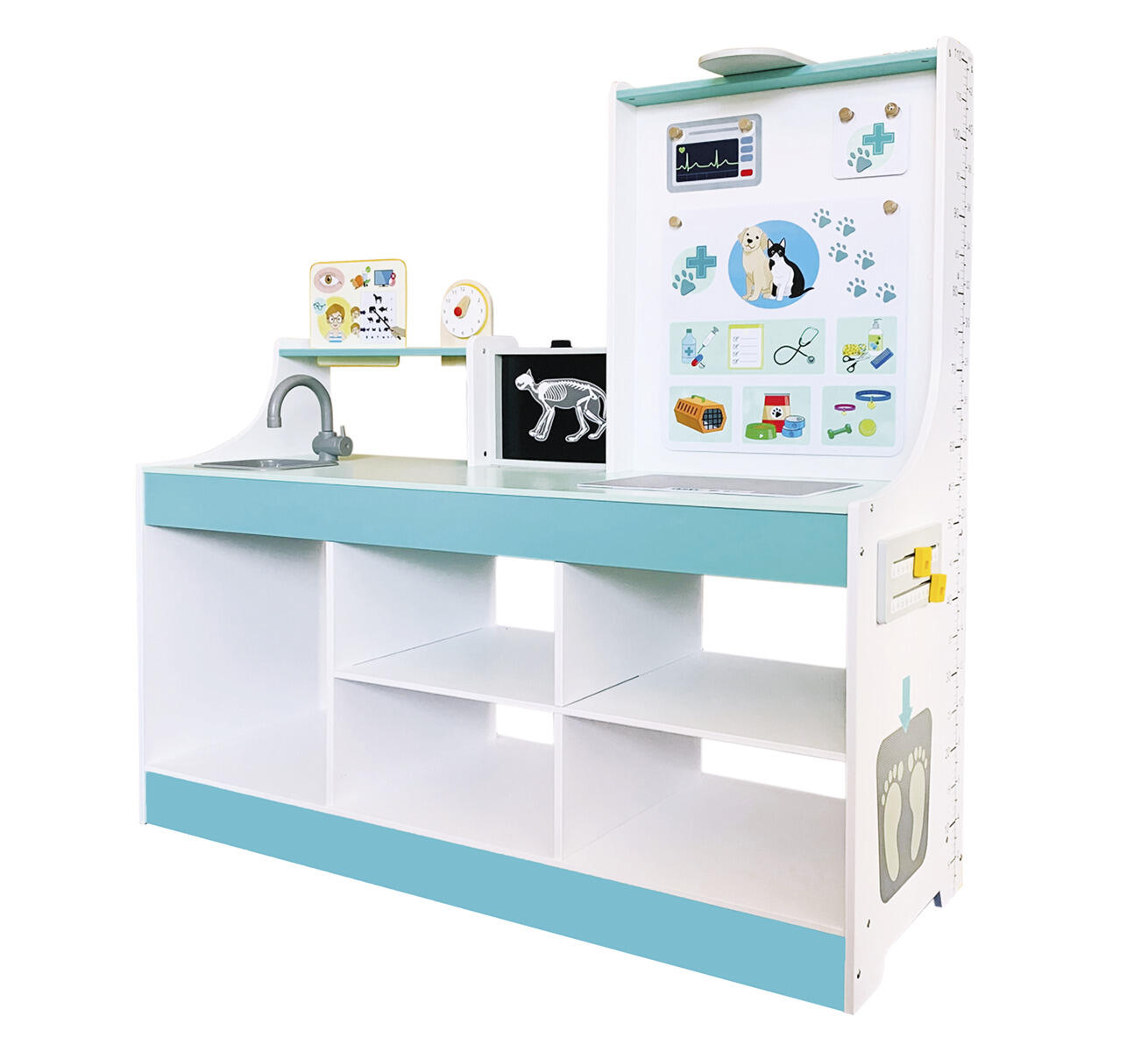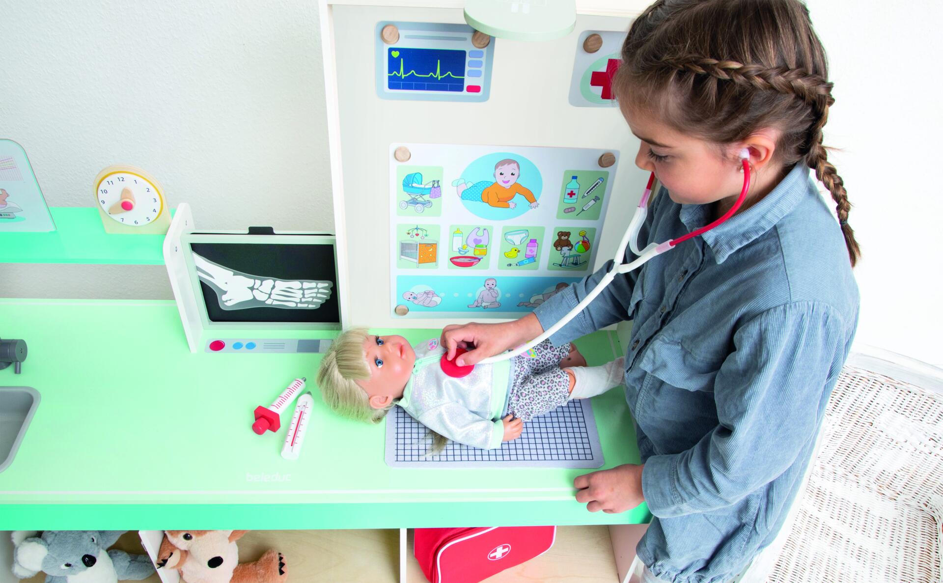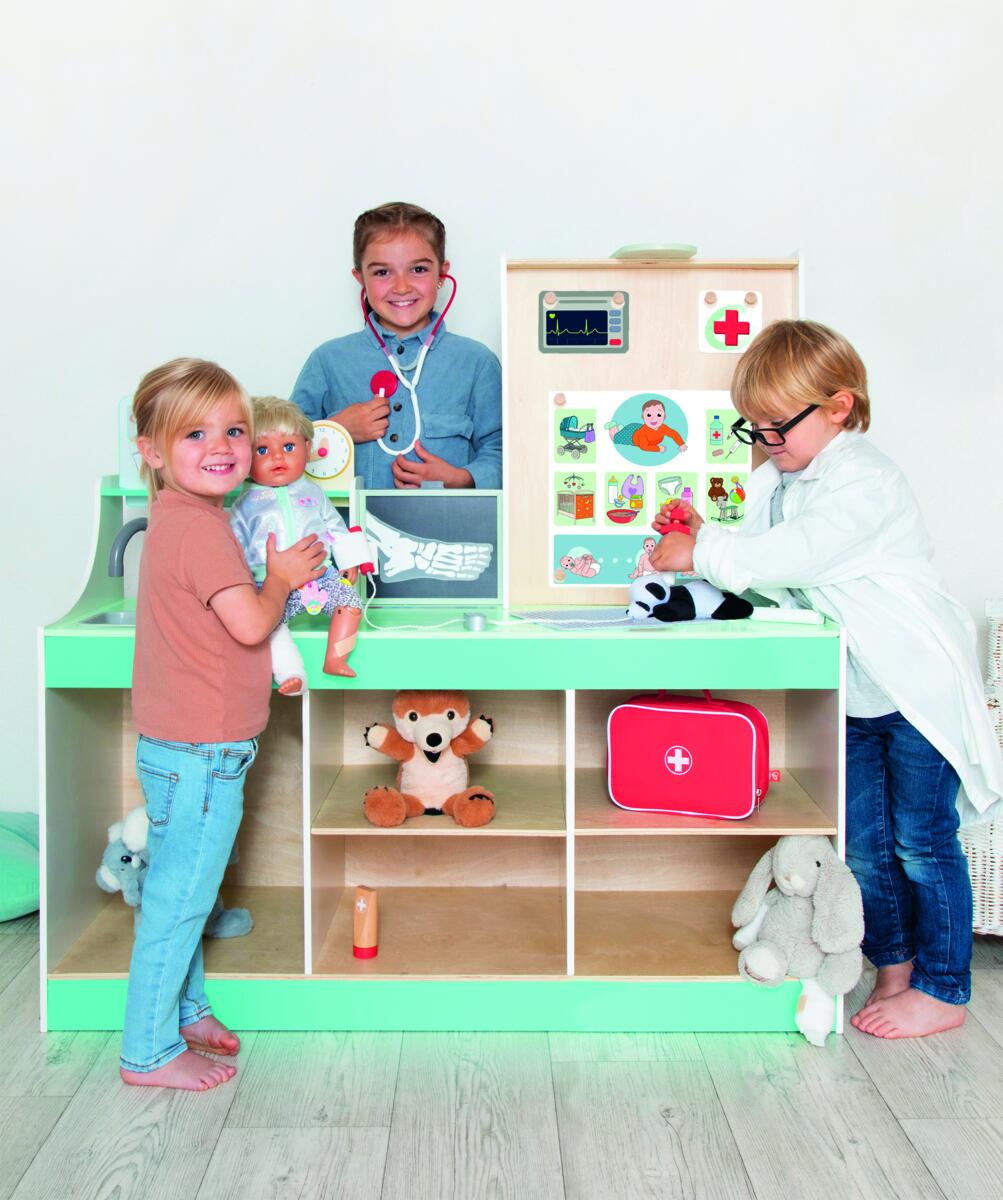 För rollspel på temat läkare. Bordet kan användas från båda sidor för t.ex. ögontester, mäta längd och titta på röntgenbilder. Barnen kan leka barnläkare, optiker och veterinär, eftersom korten kan bytas ut. Mjukisdjur eller dockor kan sedan användas som patienter. Mått: 110x112x40 cm. PVC-fri. Av FSC-märkt plywood, MDF och trä. Från 3 år.