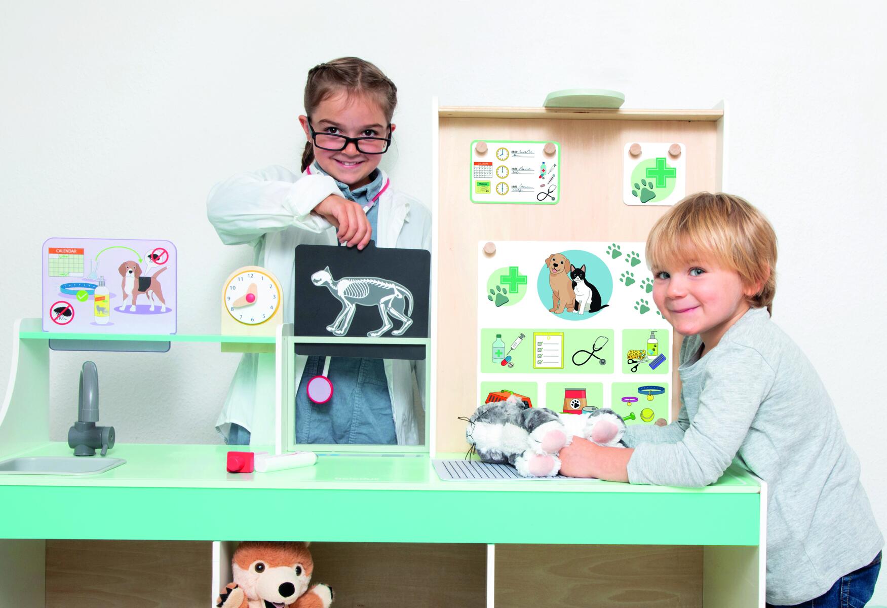 12 delar. Allt en ung veterinär behöver för att vårda sjuka nallar eller dåliga djur som ska bli friska. Mått: 8,5x15x20 cm. Av FSC-märkt trä, polyester och bomull. PVC-fri. Från 3 år.