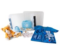 6 delar. Doktorsväska i tyg med instrument av PE. Innehåller: stetoskop, termometer, spruta, blodtrycksmätare, plåster och lampa till örat. Perfekt för den lilla läkaren eller sjuksköterskan. Från 3 år.