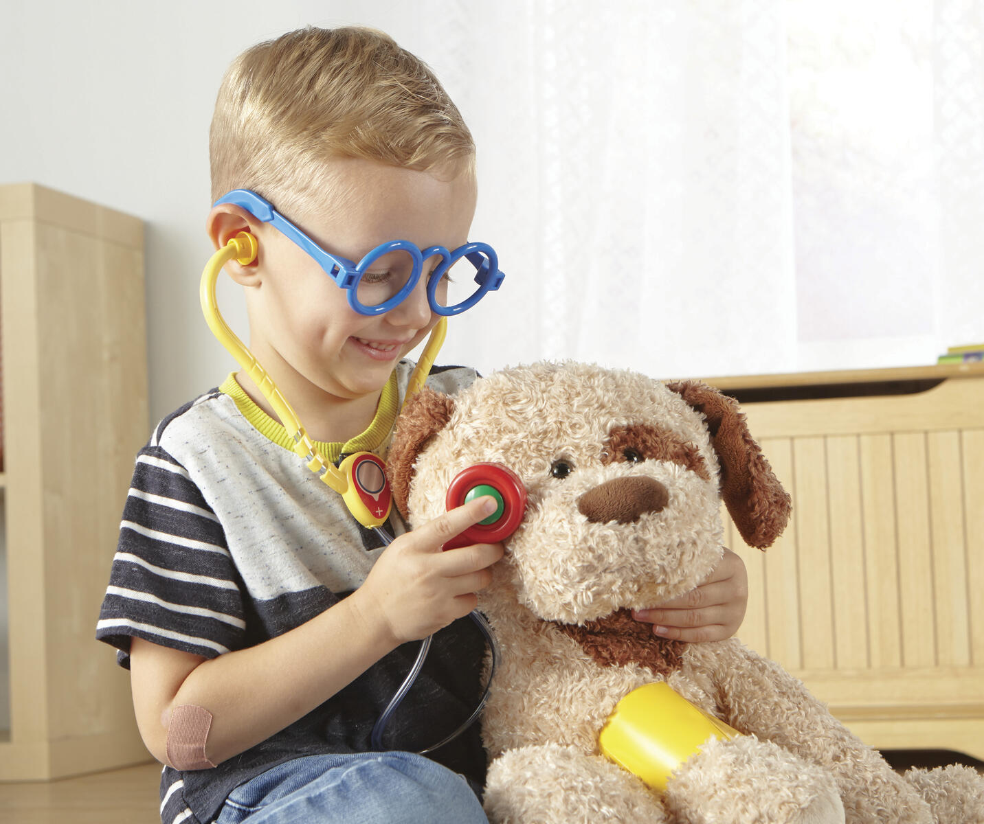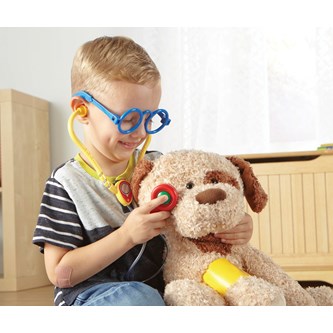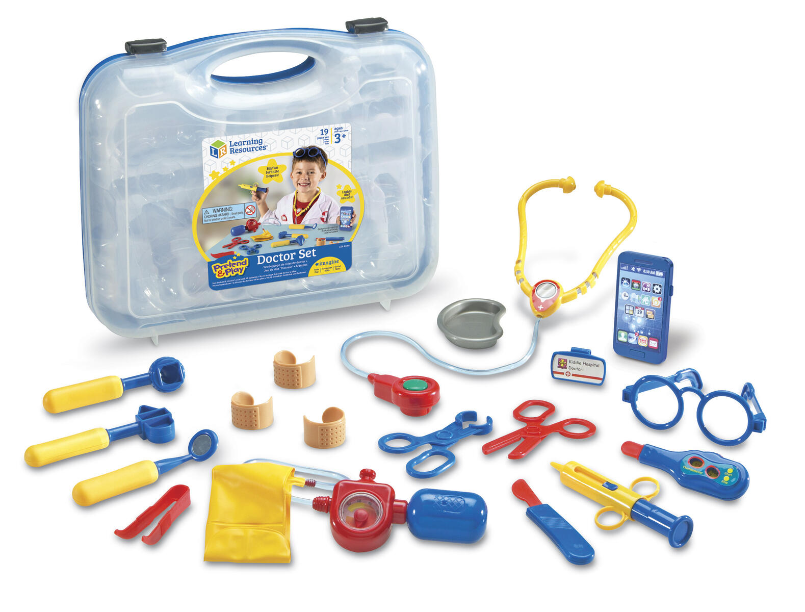 6 delar. Doktorsväska i tyg med instrument av PE. Innehåller: stetoskop, termometer, spruta, blodtrycksmätare, plåster och lampa till örat. Perfekt för den lilla läkaren eller sjuksköterskan. Från 3 år.