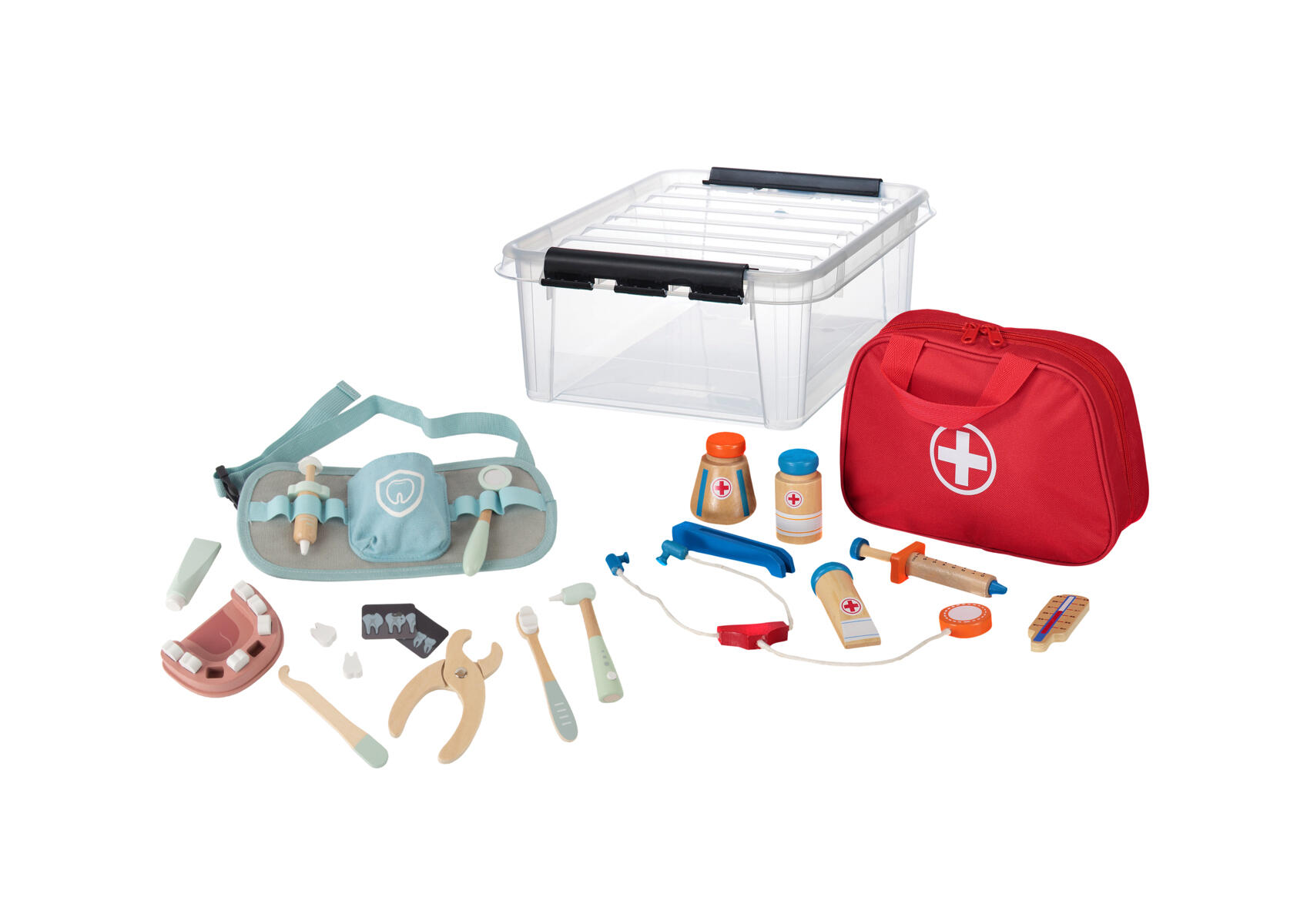 En doktorsväska med åtta instrument av FSC-märkt trä. Idealisk för rollekar och för att avdramatisera läkarbesök. Mått på väska: 20x8x14 cm. PVC-fri. Från 3 år.